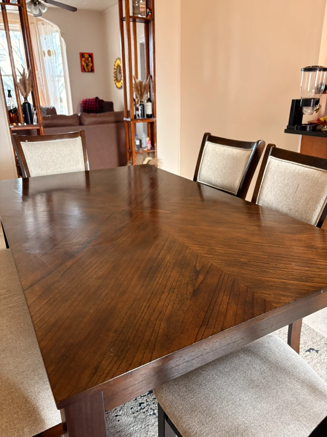 Beautiful dark wood dining table with a unique chevron wood grain pattern on top. It comes with four upholstered dining chairs in a neutral beige fabric. This set seats four comfortably.