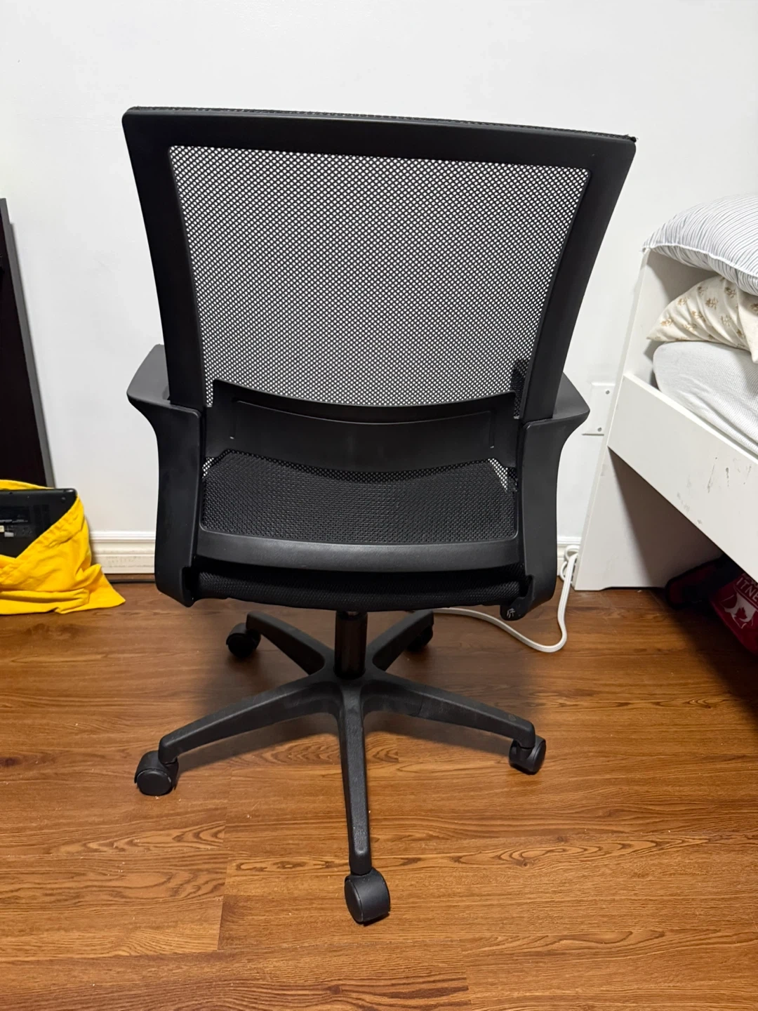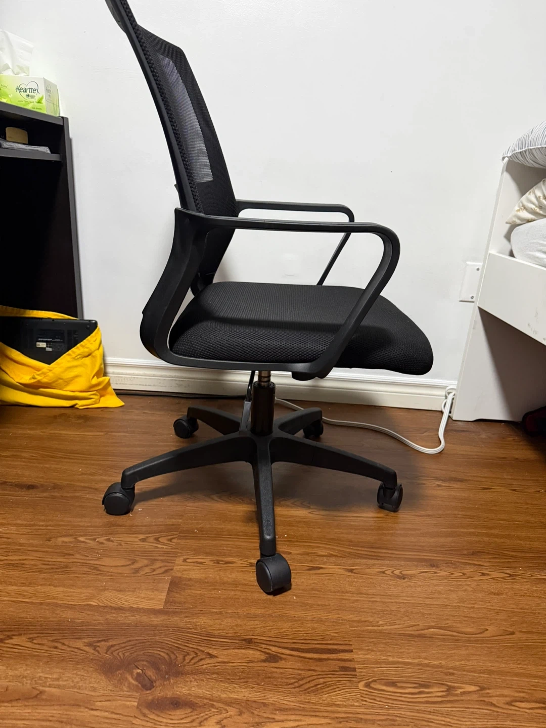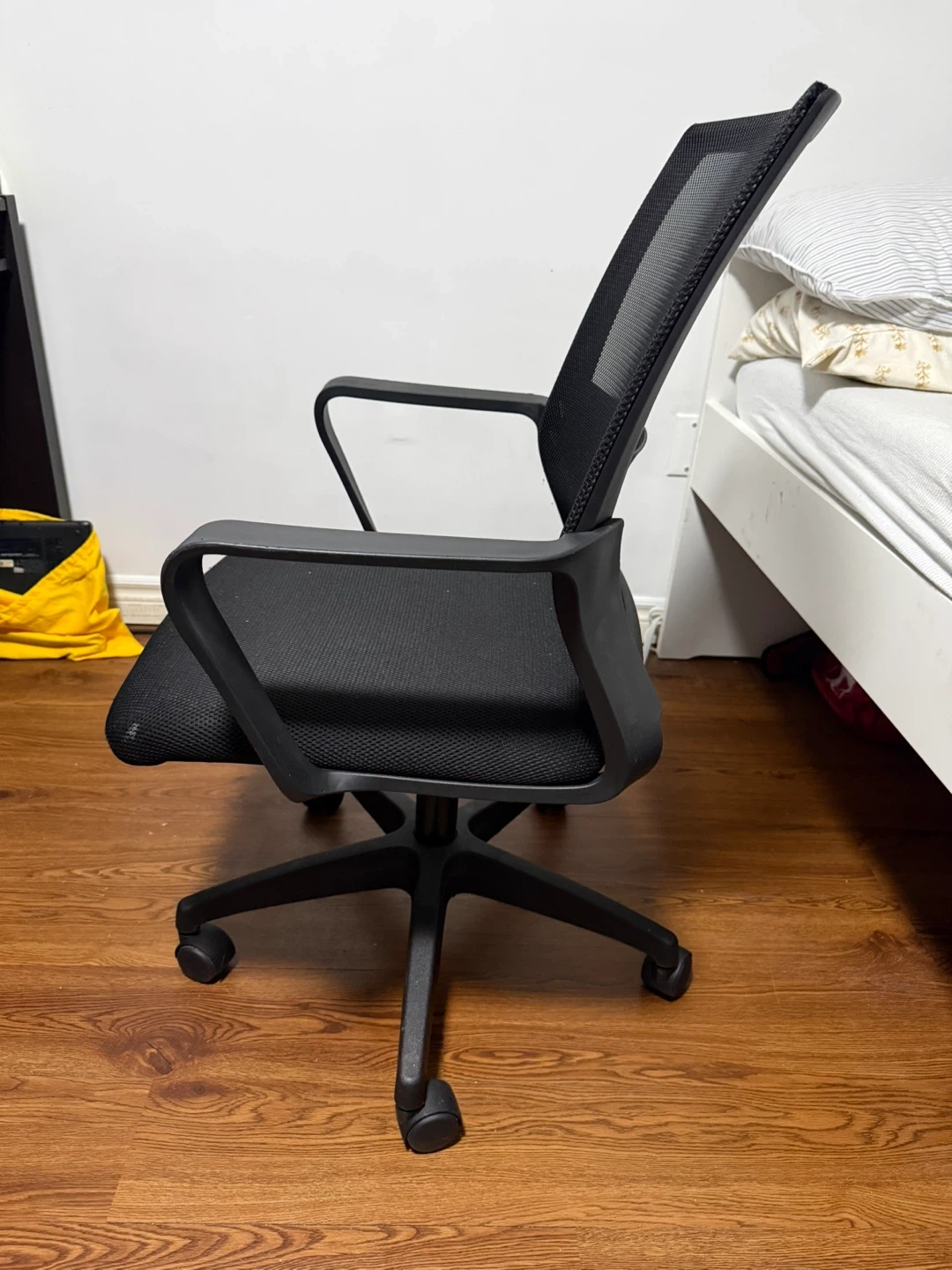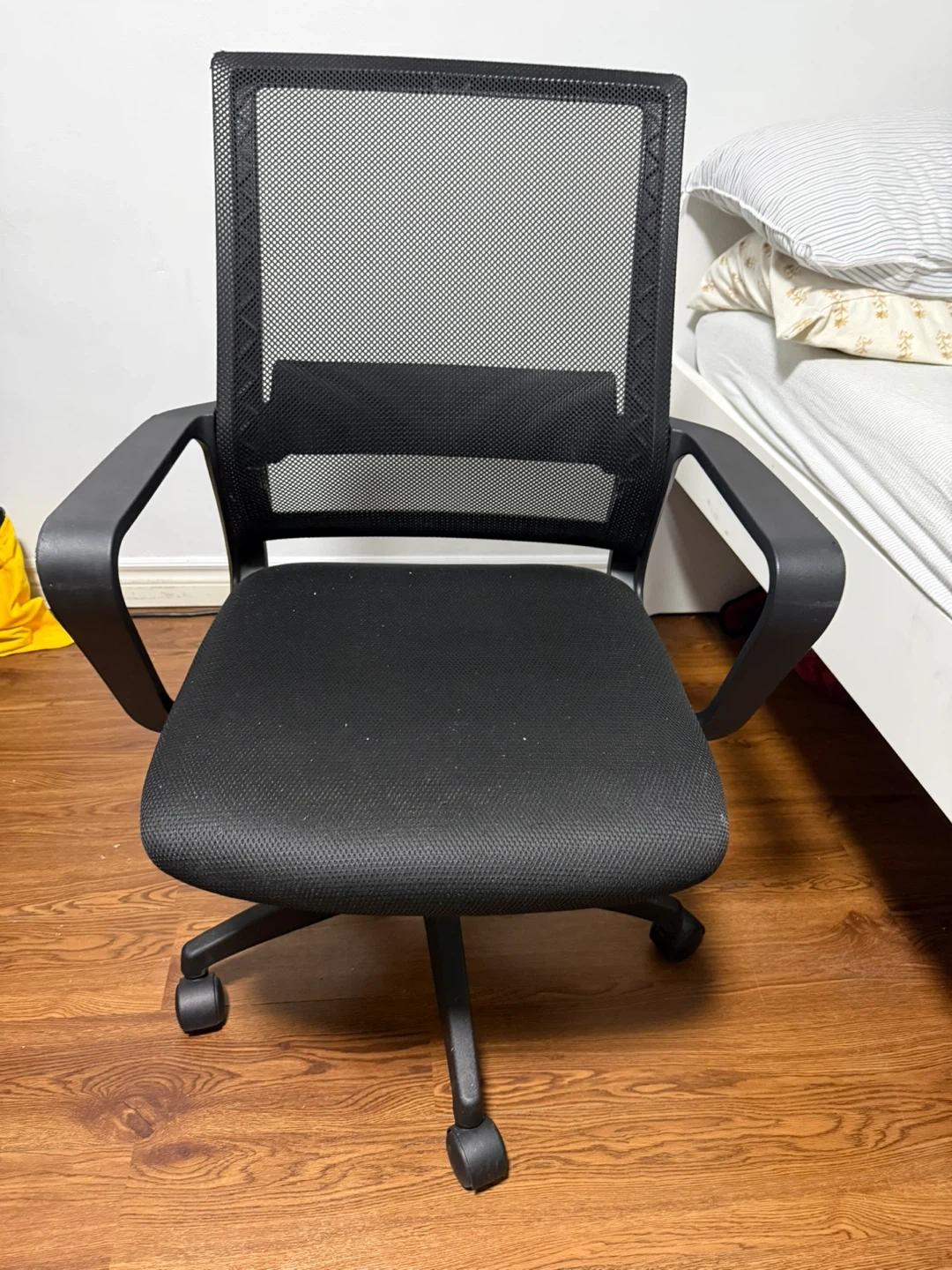 Selling a black mesh office chair. It's in great shape and ready for a new workspace! The mesh back provides good airflow, and the chair is adjustable for comfort. Perfect for your home office or study area.