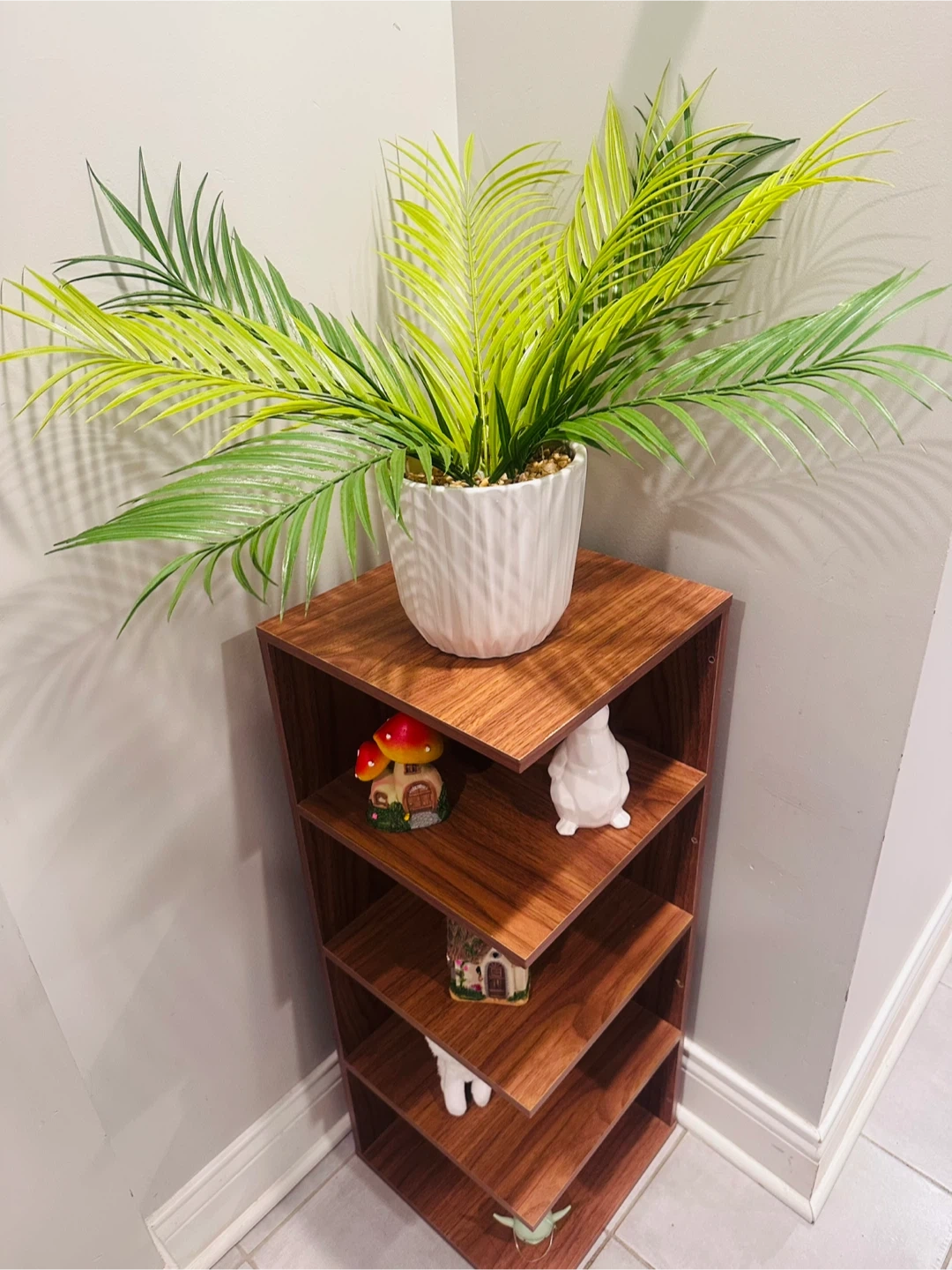This corner shelf unit has a rich wood finish and five tiers for display. It includes a decorative faux palm plant in a white textured pot. Great for adding a touch of greenery and storage to any room!