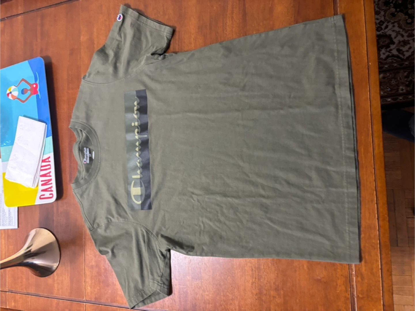 Selling a Champion t-shirt in olive green. It's a size large and in great condition! Perfect for casual wear or working out. The material is soft and comfortable. From the Champion Authentic Athleticwear line