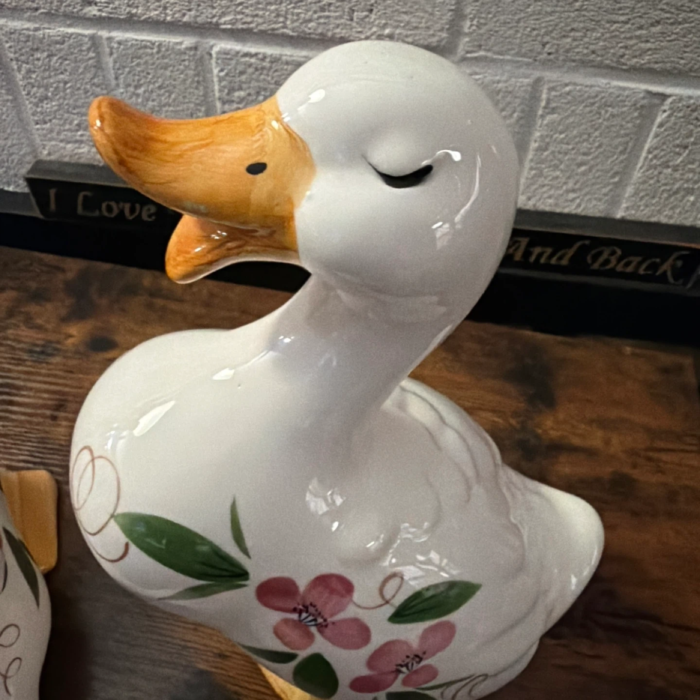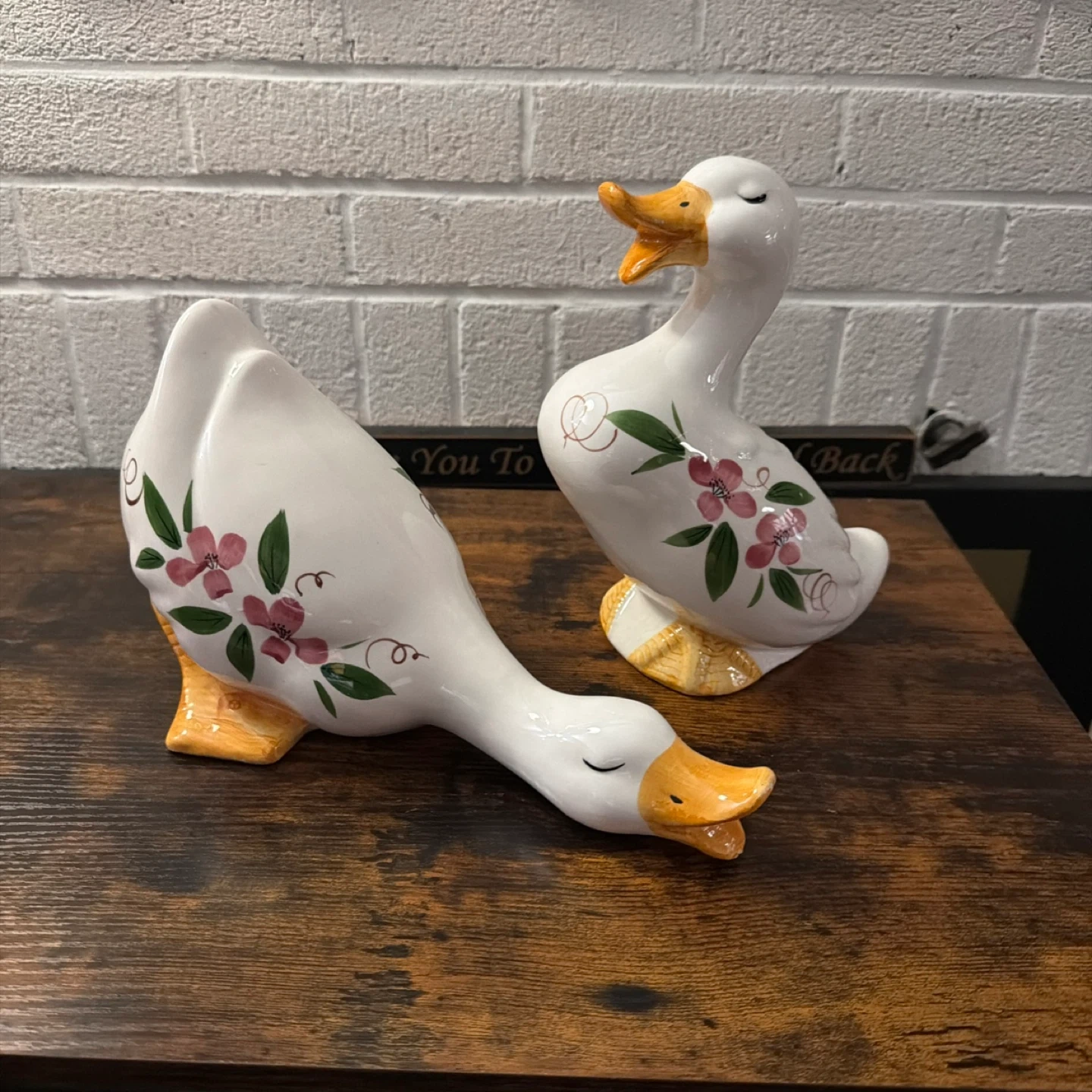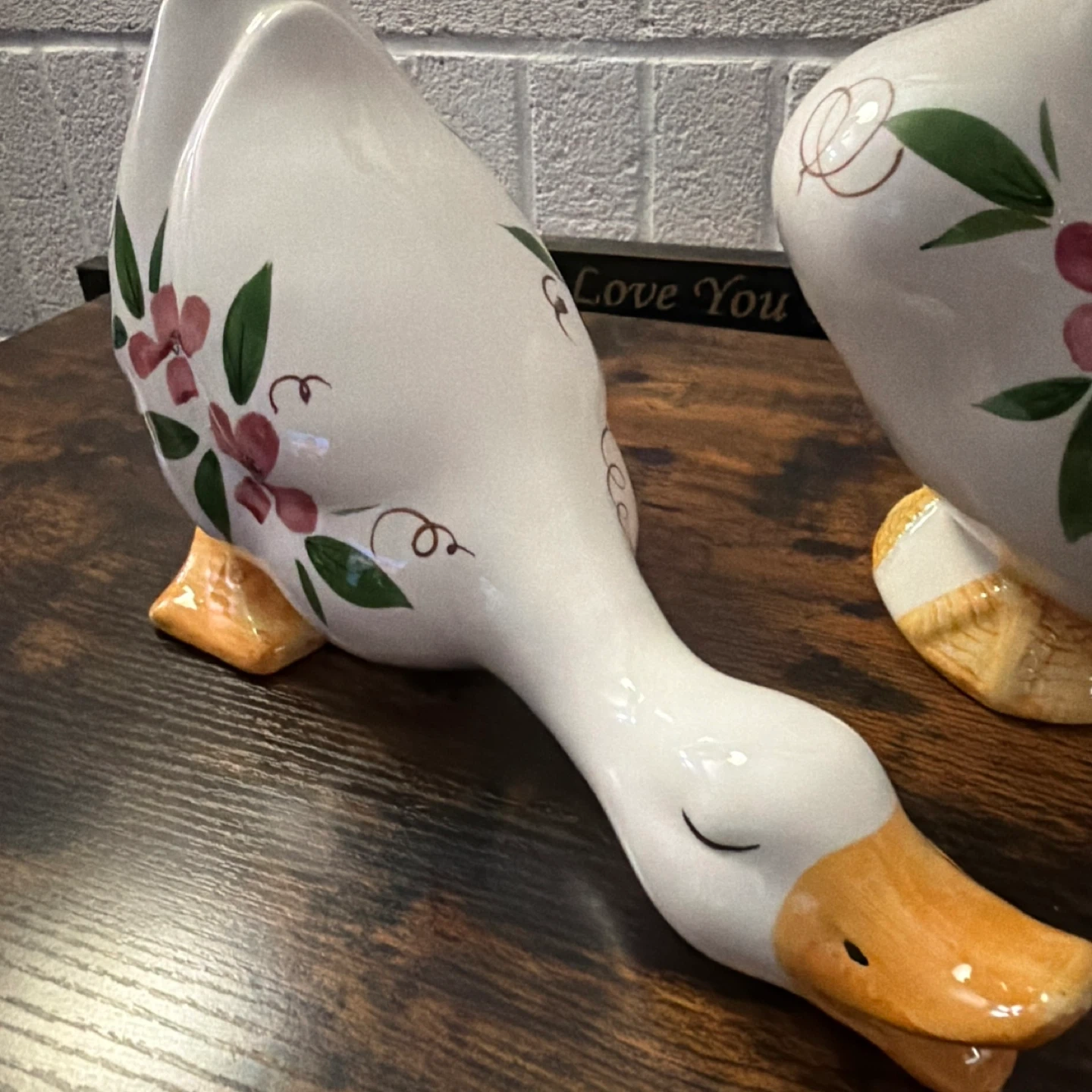 These charming ceramic duck figurines are hand-painted with delicate flowers. One duck is in a resting pose, while the other is in a playful, bowed position. They're perfect for adding a touch of whimsy to your home decor!
