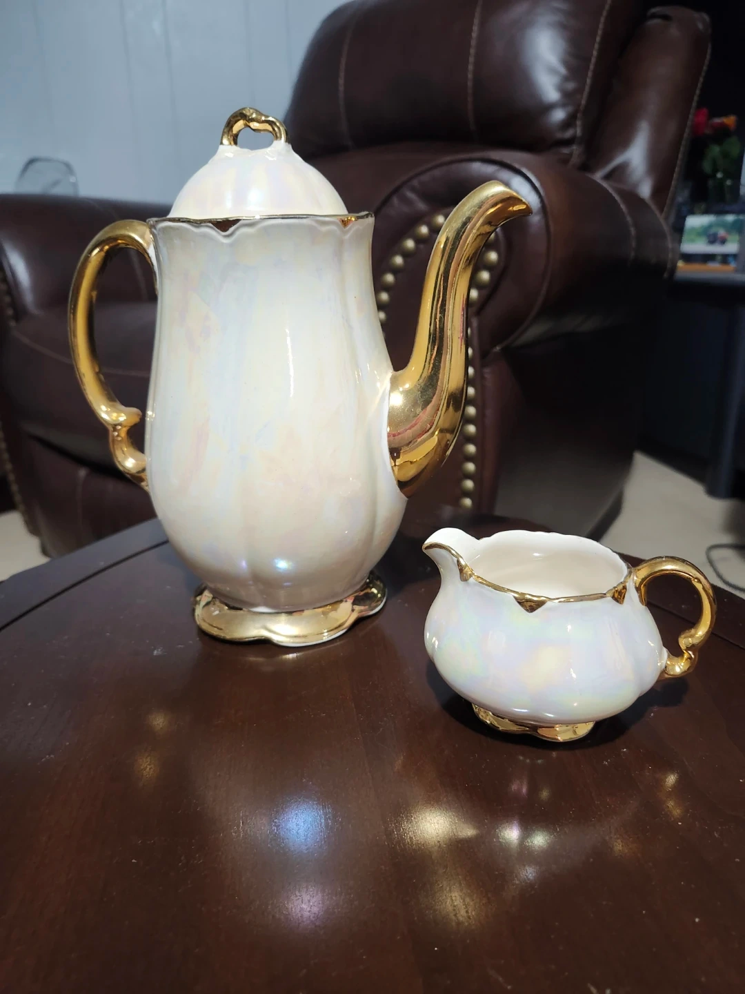 A two-piece set featuring a creamer pitcher and a teapot. Both pieces have a pearlescent white finish with gold trim and handles. They're made of ceramic.
