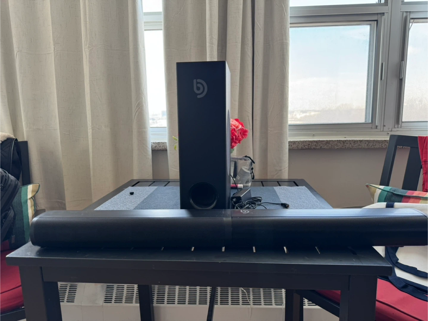 Black Soundbar and Subwoofer Speaker System