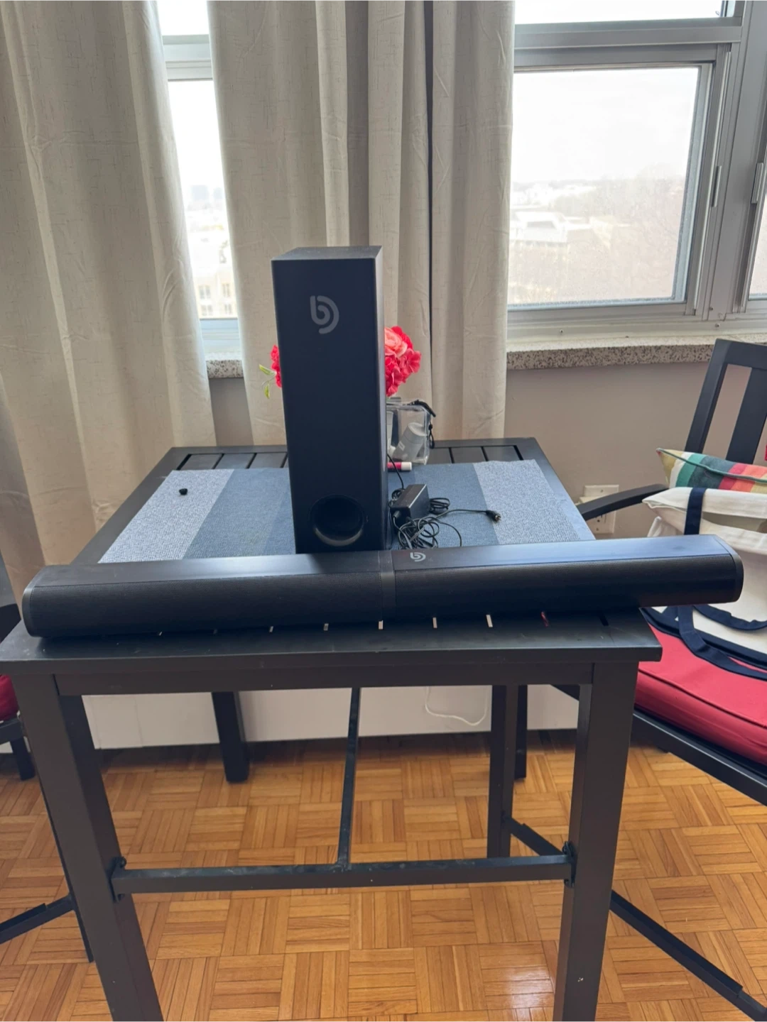This is a black soundbar and subwoofer speaker set. It includes the soundbar, subwoofer, and power adapter. The system delivers clear audio for your entertainment setup.
