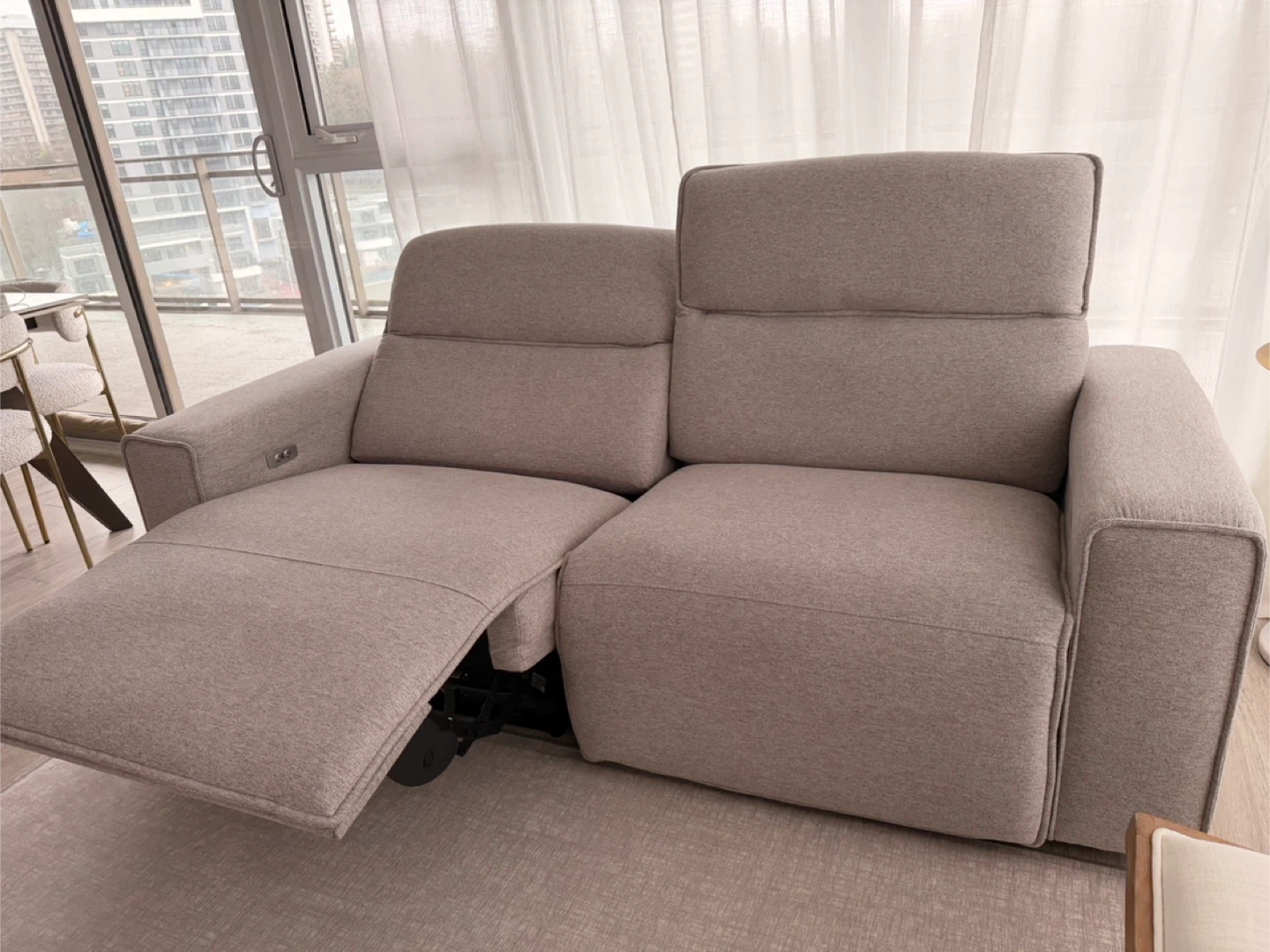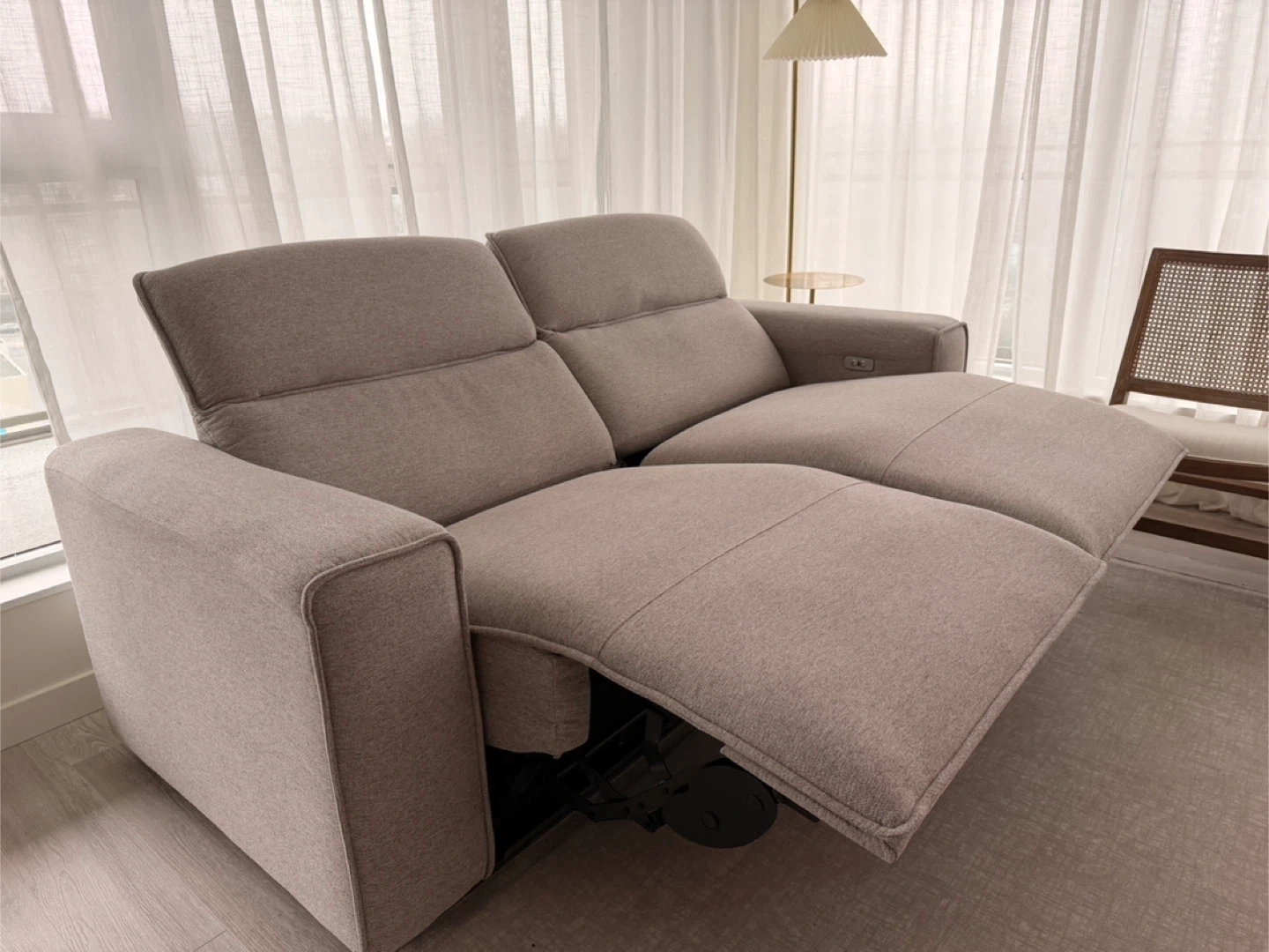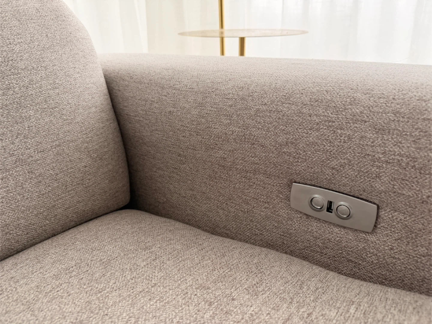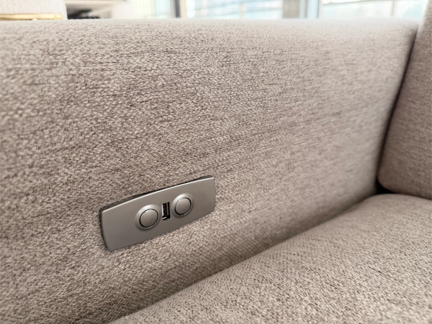 Power recliner sofa with adjustable head rest and USB power charge ports.