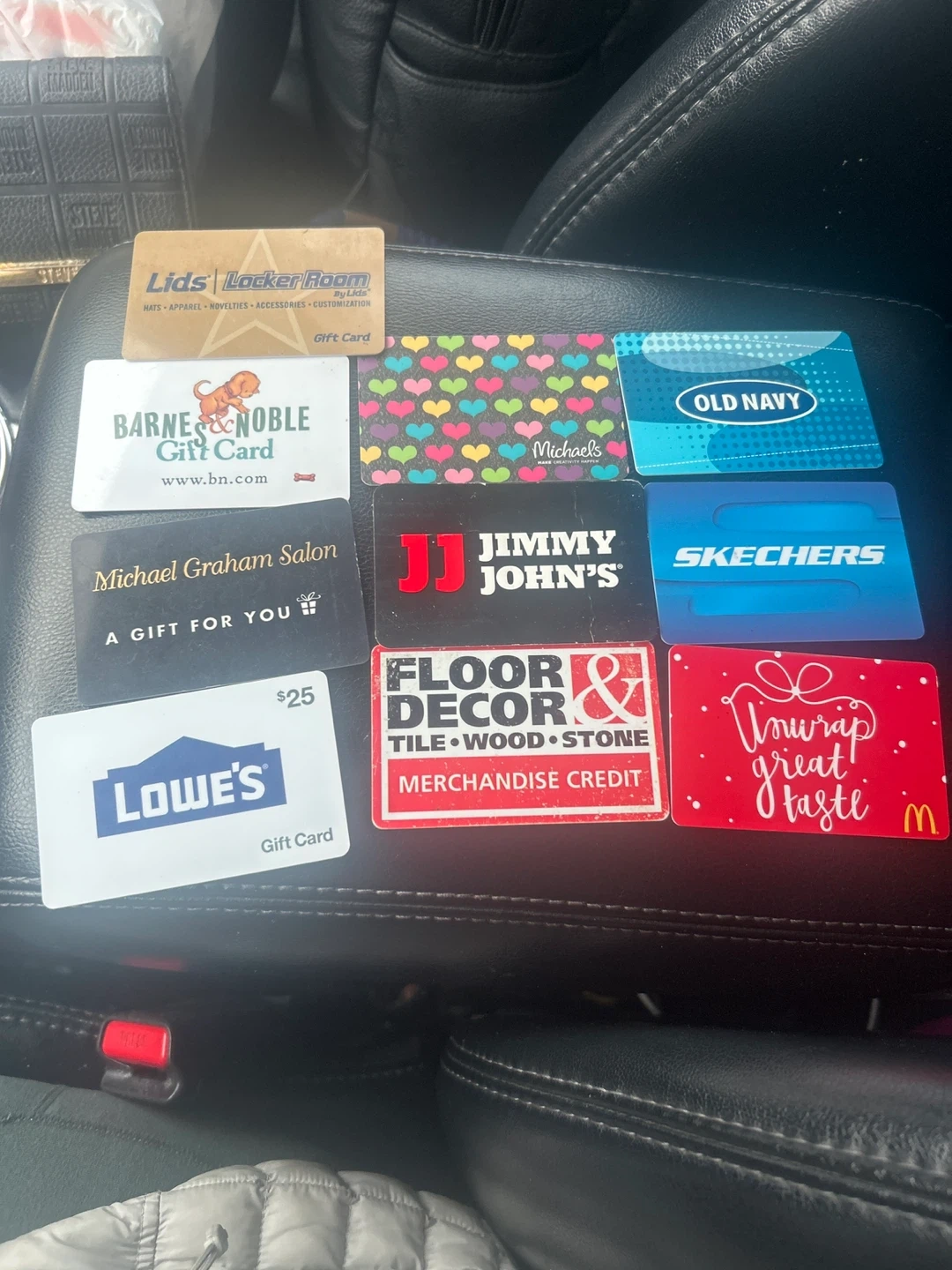 Bundle of assorted gift cards. Includes Lowe's $25 gift card, Barnes & Noble, Old Navy, Michaels, Lids Locker Room, Jimmy John's, Skechers, Michael Graham Salon, and Floor & Decor merchandise credit. Perfect for gifting or personal use!