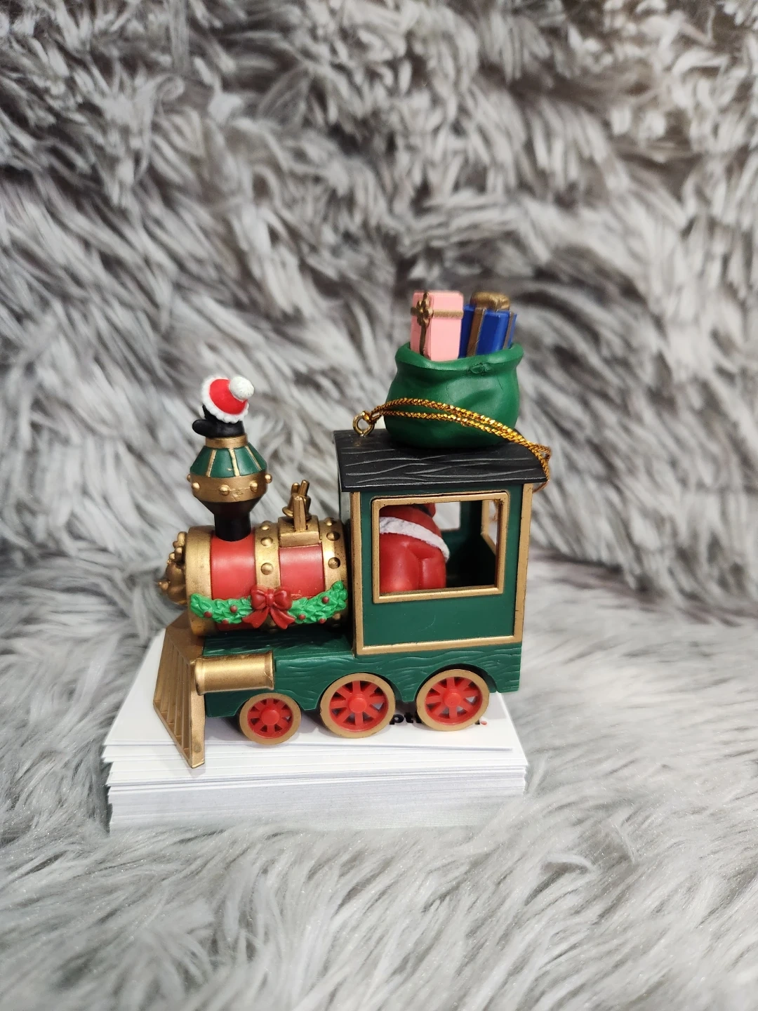 This festive Christmas ornament features a green train with Santa Claus waving from the window and a penguin on top. It's adorned with red and gold accents and a green bag filled with presents. The ornament has a gold hanging loop.