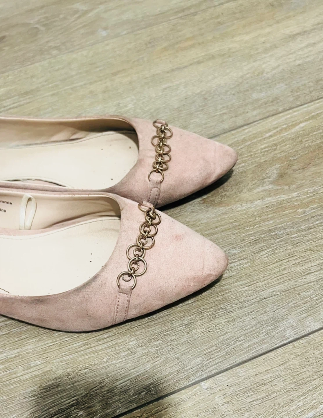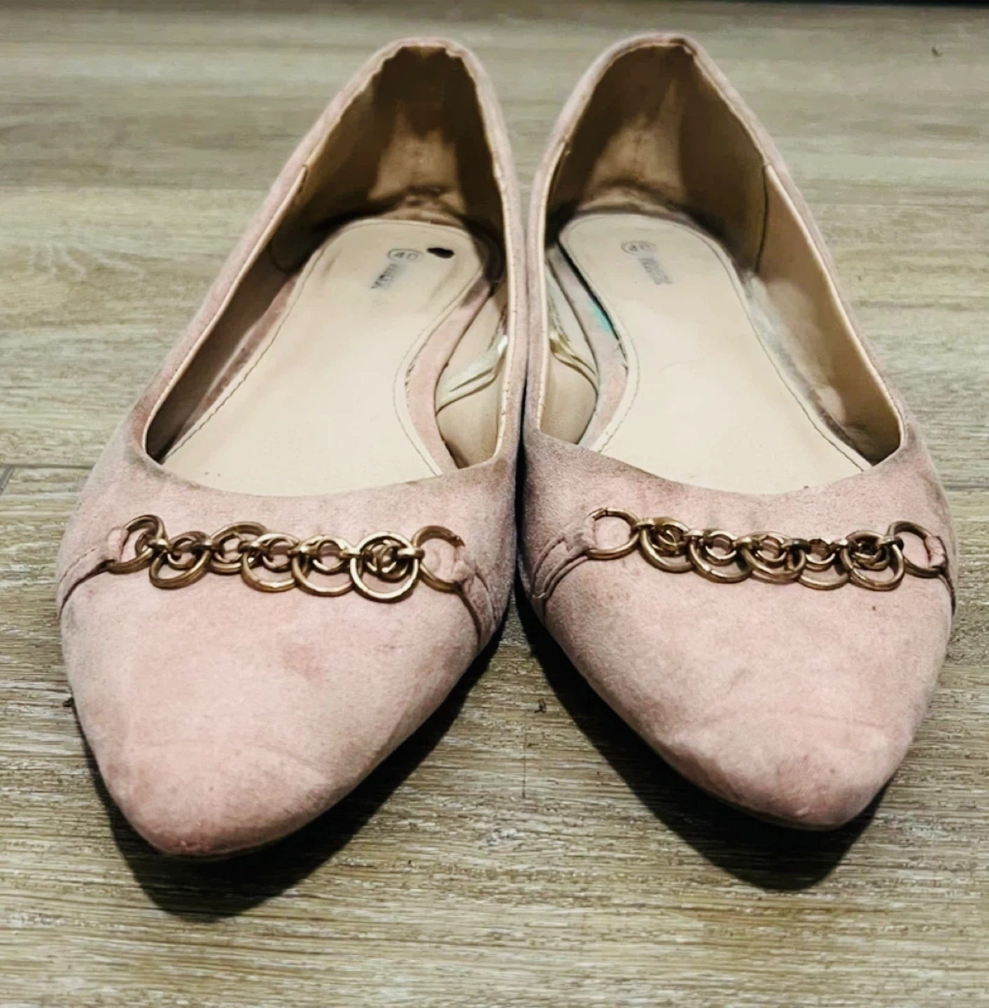 Cute washable ballet flats with a chain detail across the front. They're a blush pink colour and would be great for dressing up or down! Selling due to relocation and item is clean, lightly used, well maintained, and ready for pickup. Price is reasonable, and serious buyers are welcome. Please feel free to message me only if you’re seriously interested, please.