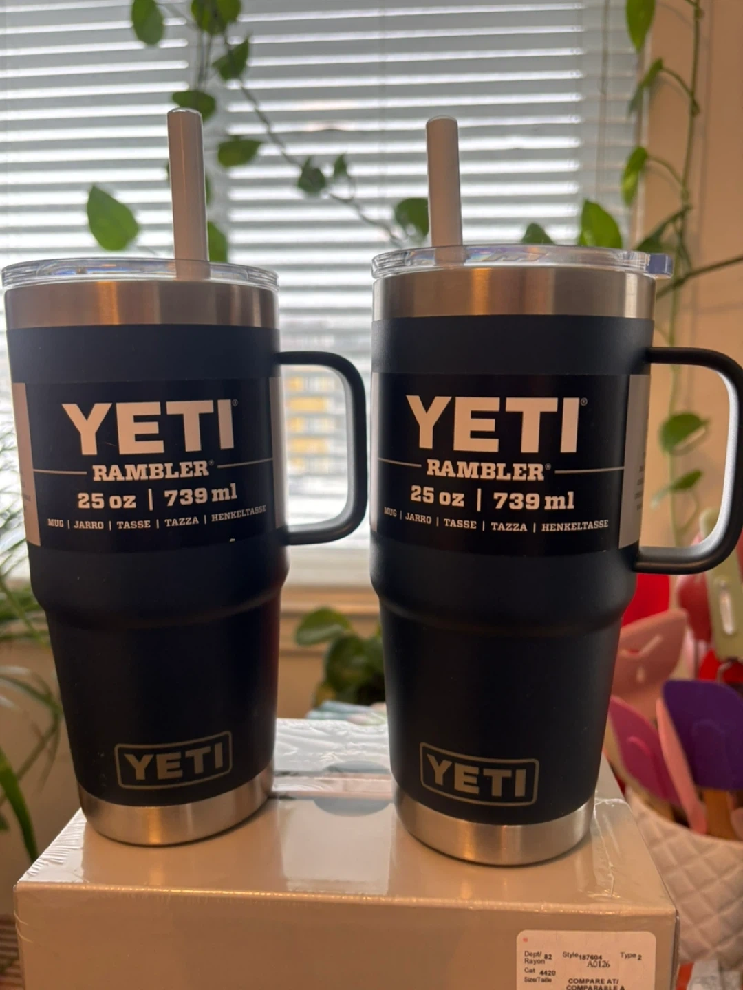 Selling two dark blue Yeti Rambler 25 oz tumblers with straws. These insulated mugs keep drinks cold or hot for hours. They're made of durable stainless steel and include handles for easy carrying.
