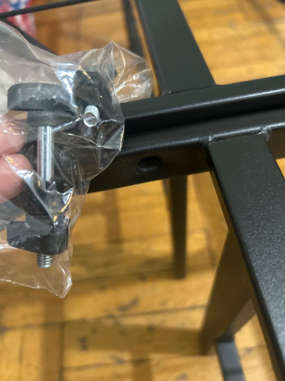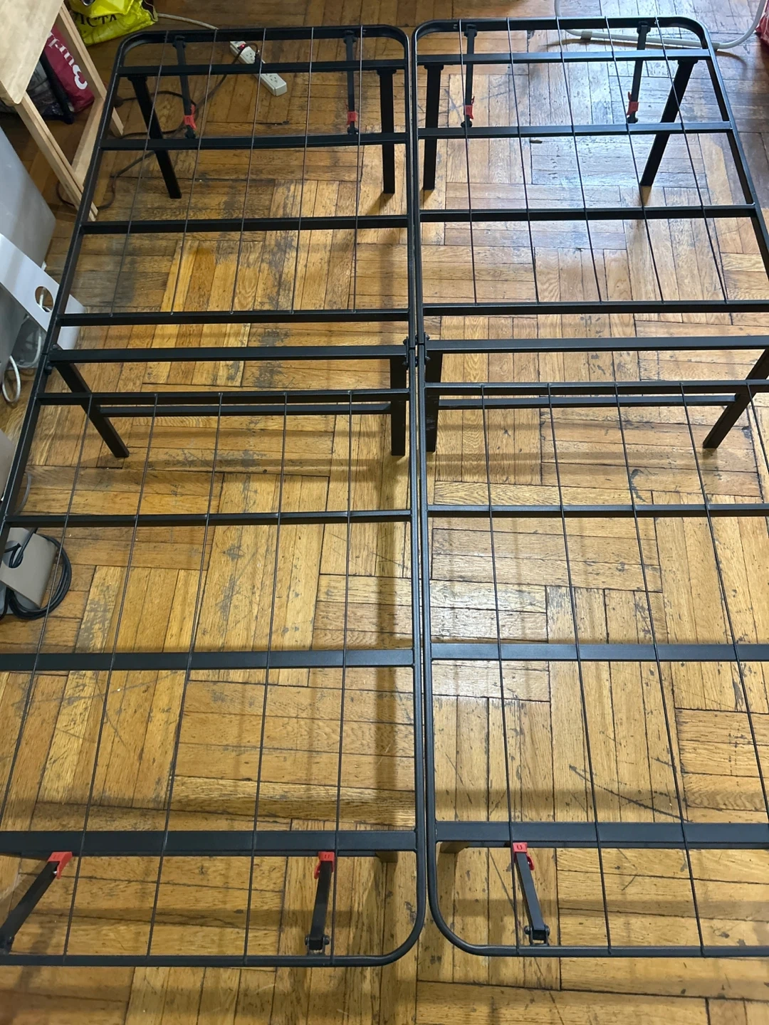 Black metal bed frame. You can hold them together with the screws provided for a full sized mattress or leave them separate and have two twin frames. Easy foldable design for transport.