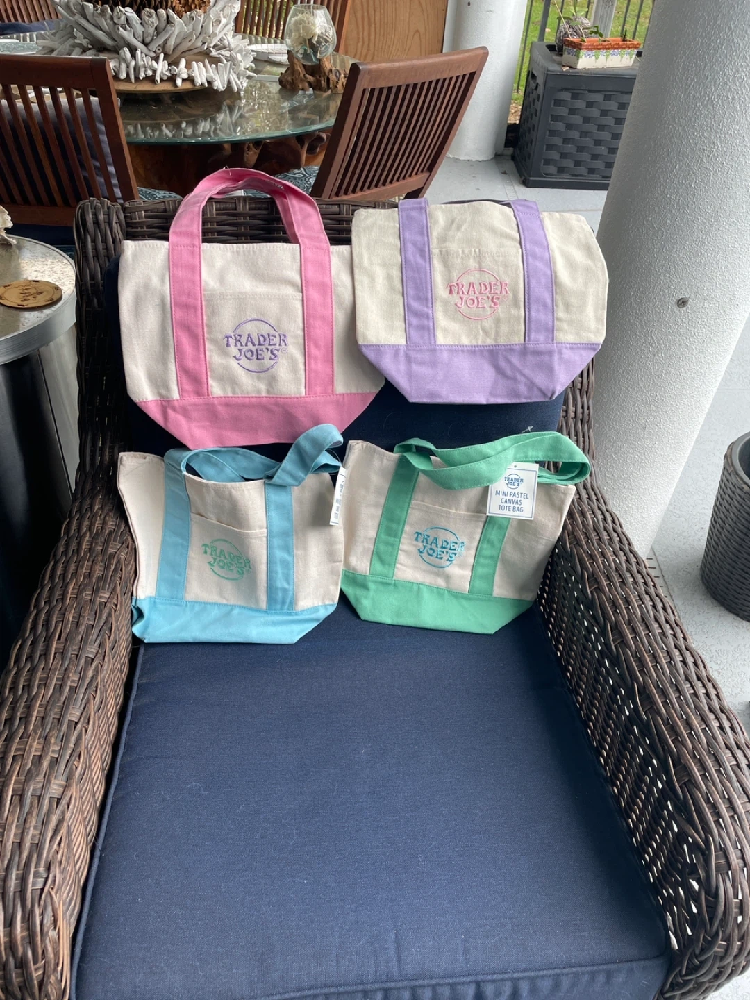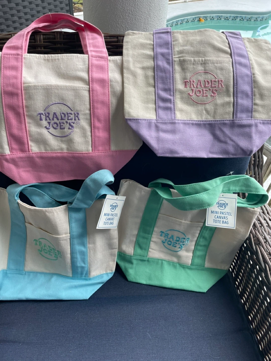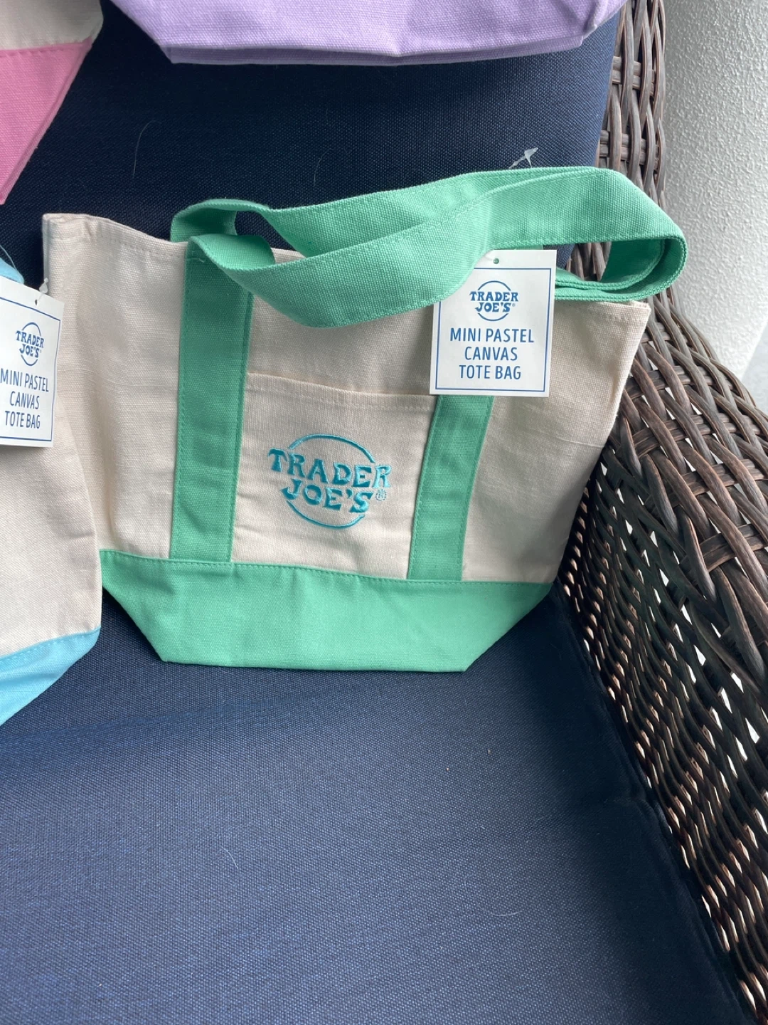 Canvas tote bag from Trader Joe's. It's a mini size. Comes in various pastel colors. Perfect for quick trips or carrying small items! Set of 4