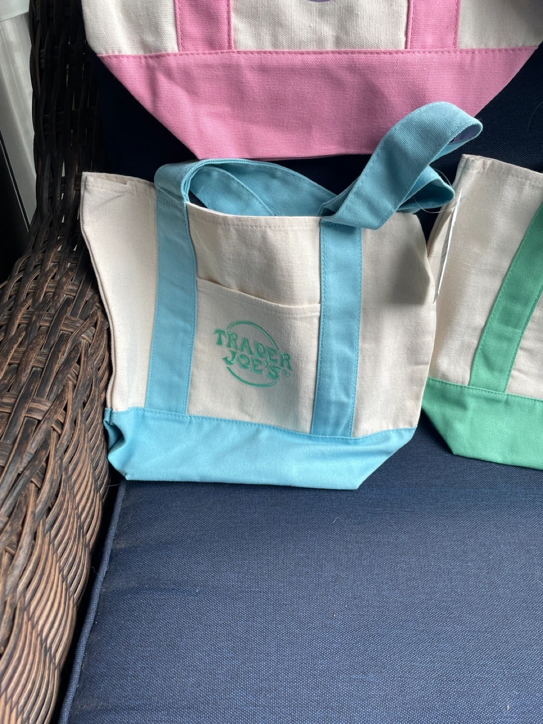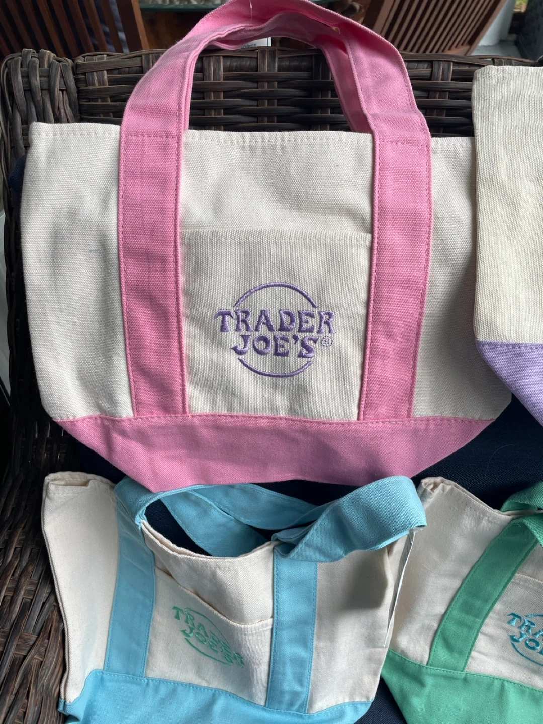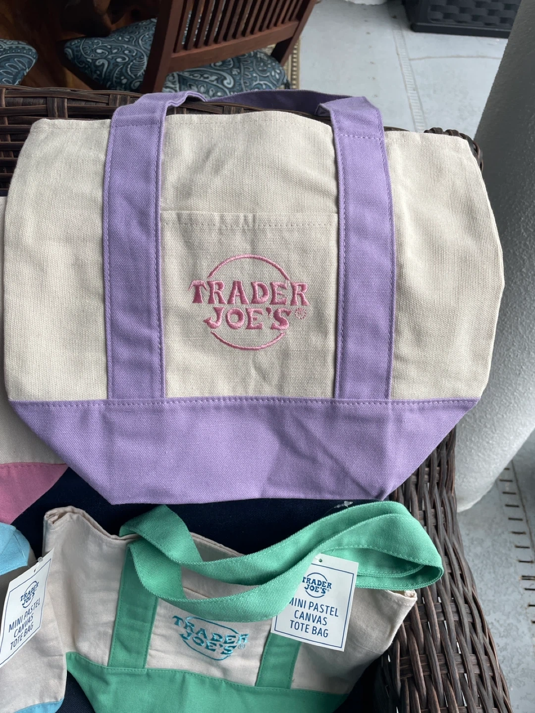 Canvas tote bag from Trader Joe's. It's a mini size. Comes in various pastel colors. Perfect for quick trips or carrying small items! Set of 4