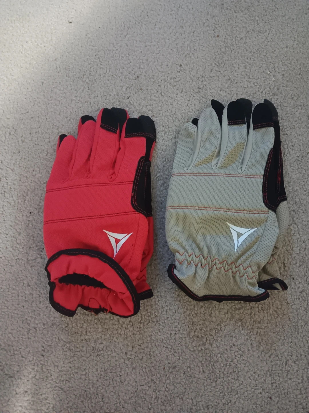 Two pairs of work gloves, one red and one grey. These gloves feature a textured grip on the palms and adjustable wrist closures for a snug fit. They are made of durable material suitable for various tasks.