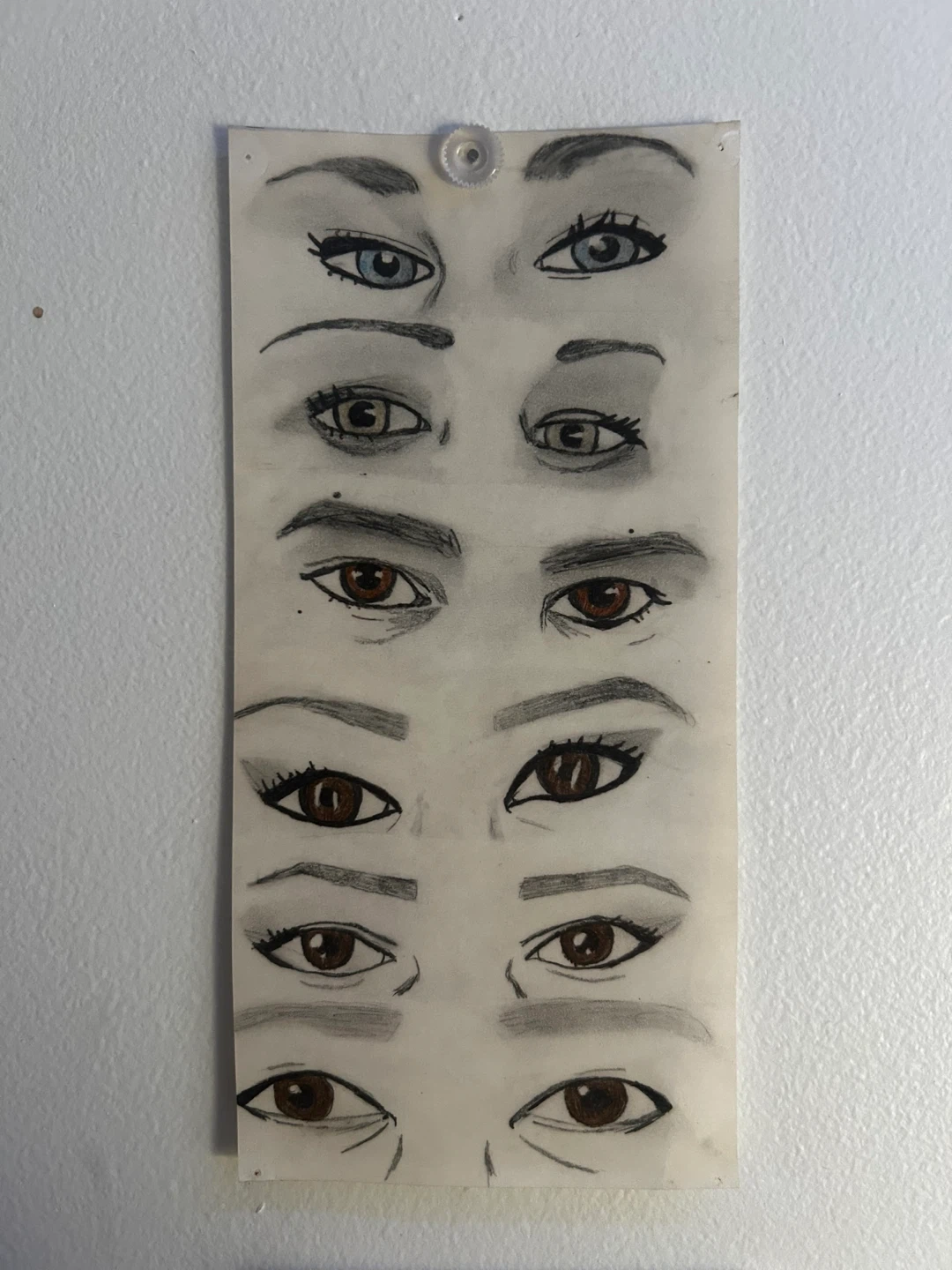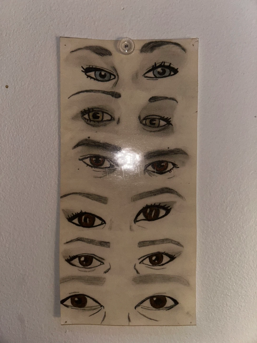 6 Eyes Piece. Comes pre-laminated. 8.5" x 4". Done with pencil. Pics are without flash and with flash.