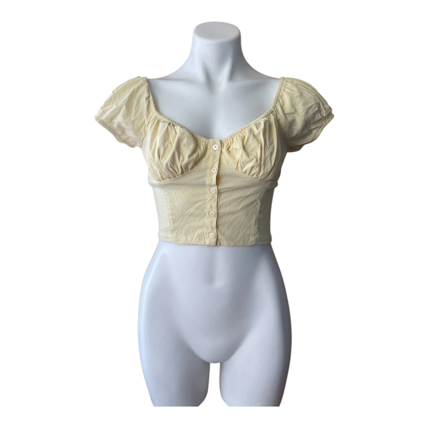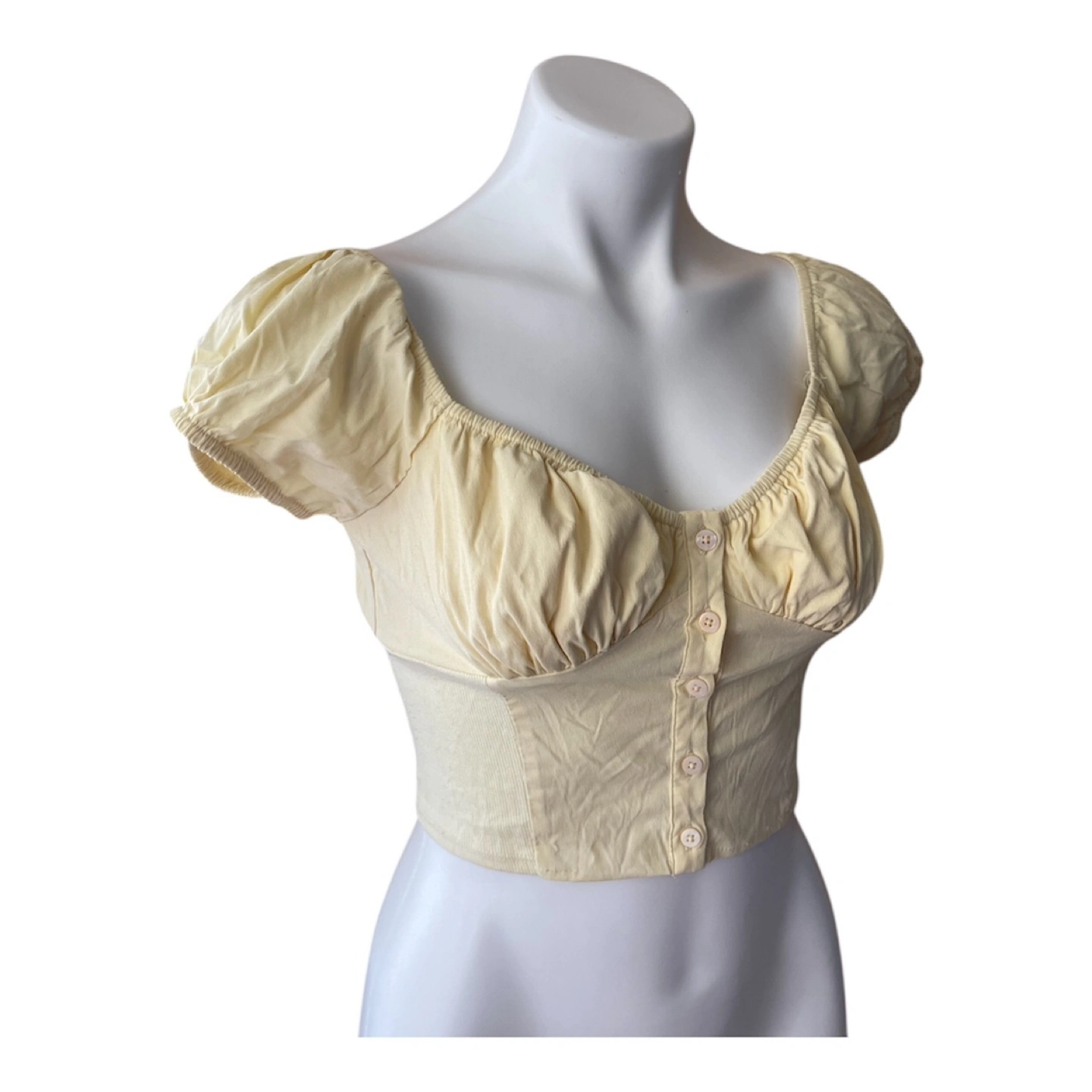 Vintage 2000s Y2K Yellow Crop Top Button Up Front Puffed Up Sleeves Peplum Style Small