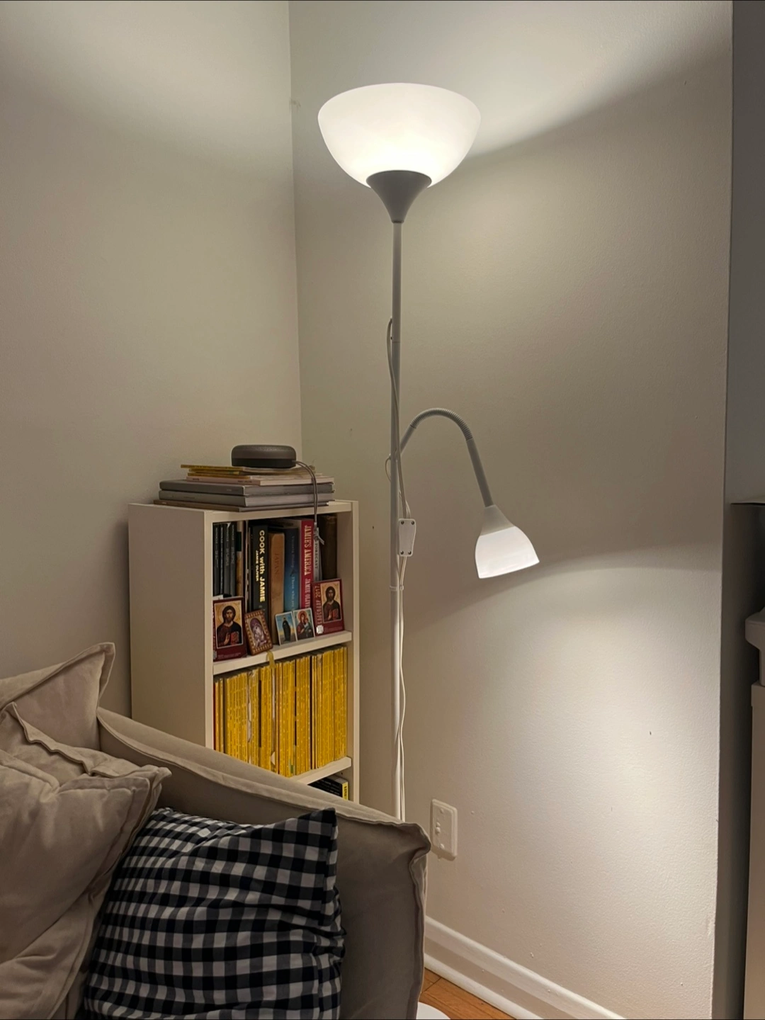Selling an Ikea floor lamp that comes with an attached reading light! It's perfect for lighting up a room and providing focused light for reading or other tasks. It's in great condition. Two LED bulbs with it.