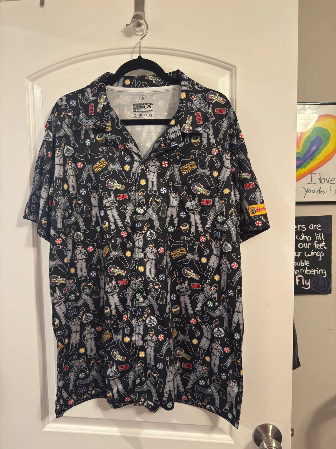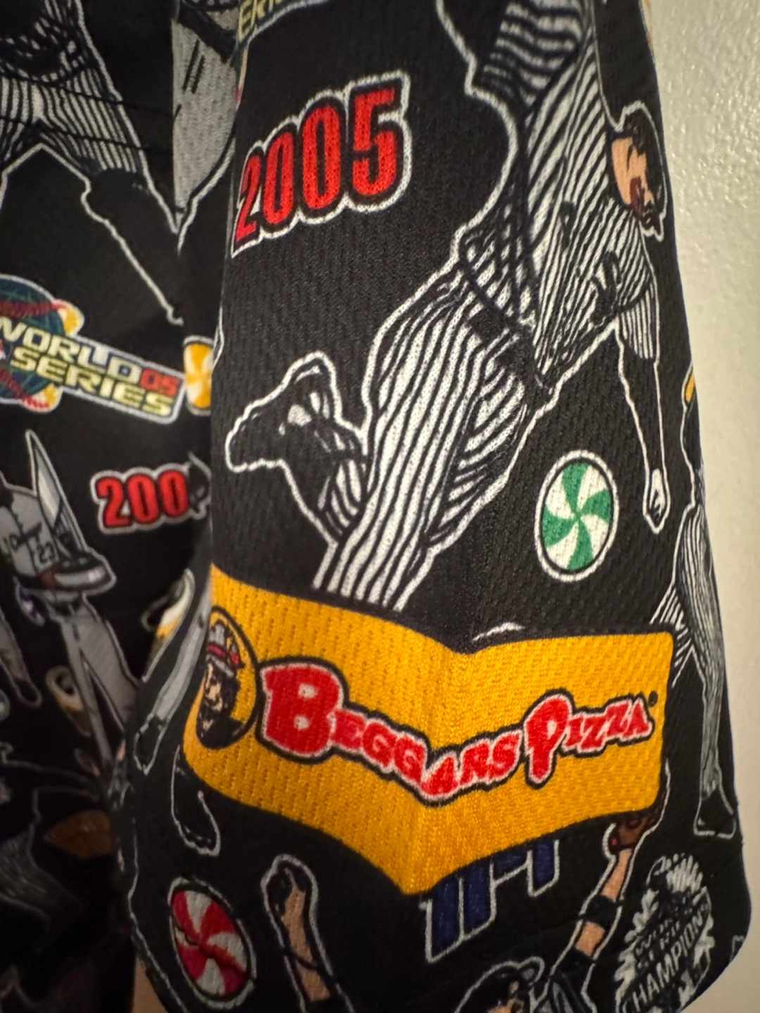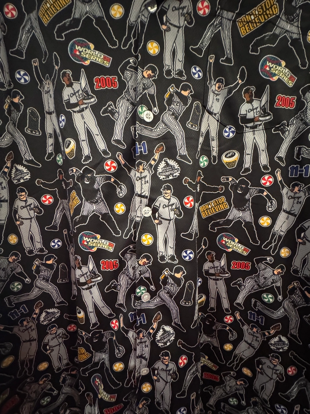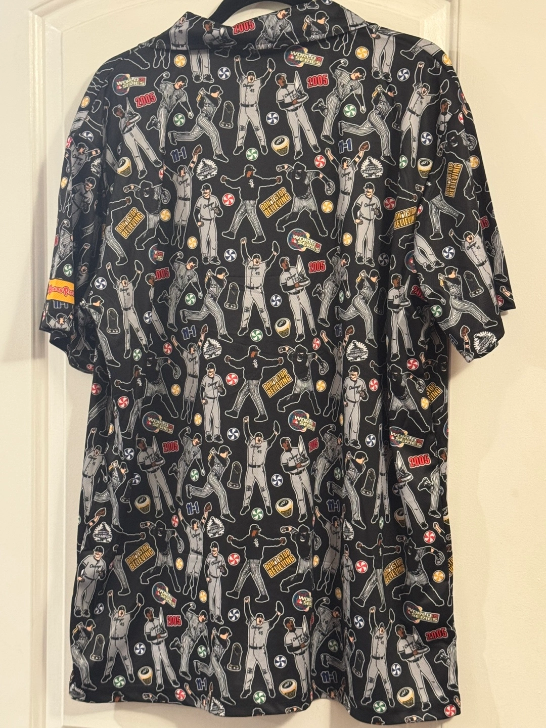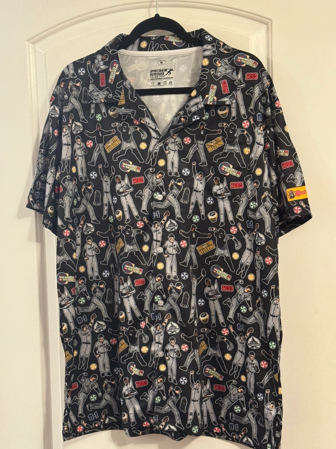 Selling a Chicago White Sox 2005 World Series 20th Anniversary shirt from Sportswear Unlimited. It's a size XL and features a cool all-over print. Perfect for any Sox fan!