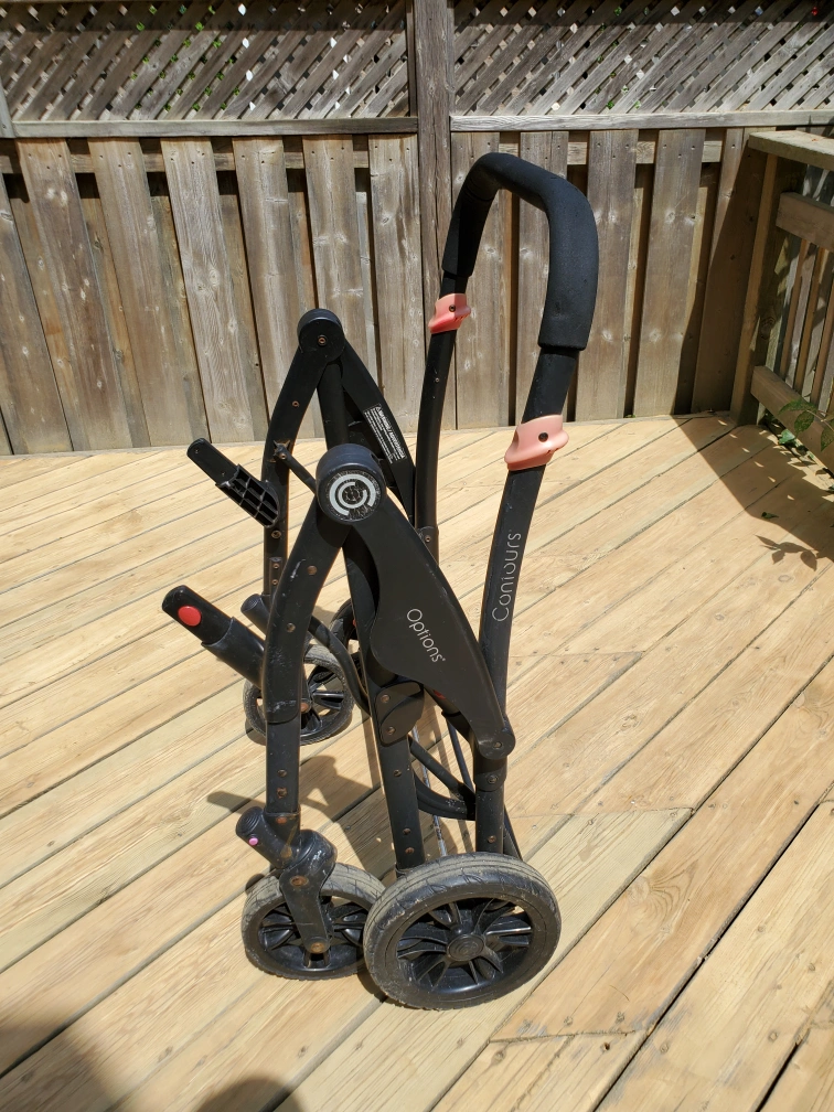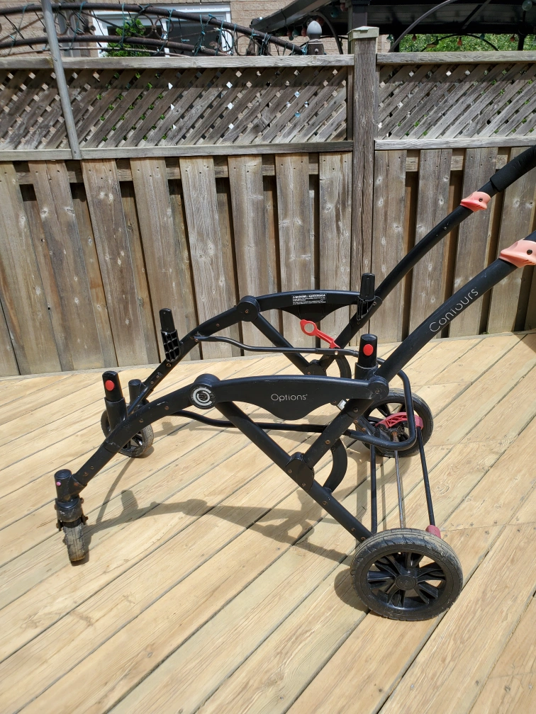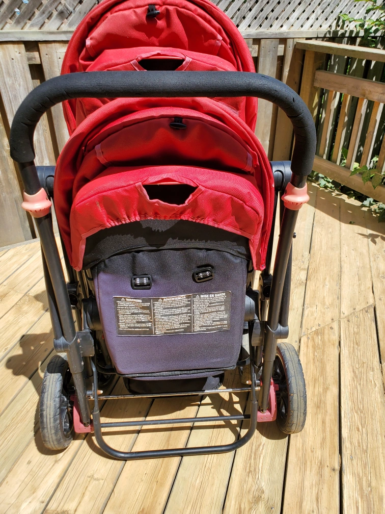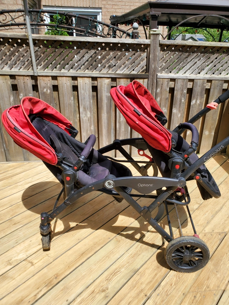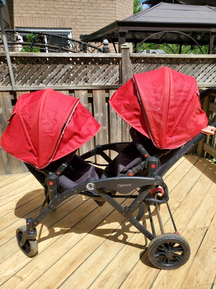 Selling a Contours Options double stroller in red and black. It's in good used condition and ready for your little ones! Great for twins or siblings close in age. This stroller offers multiple seating configurations.