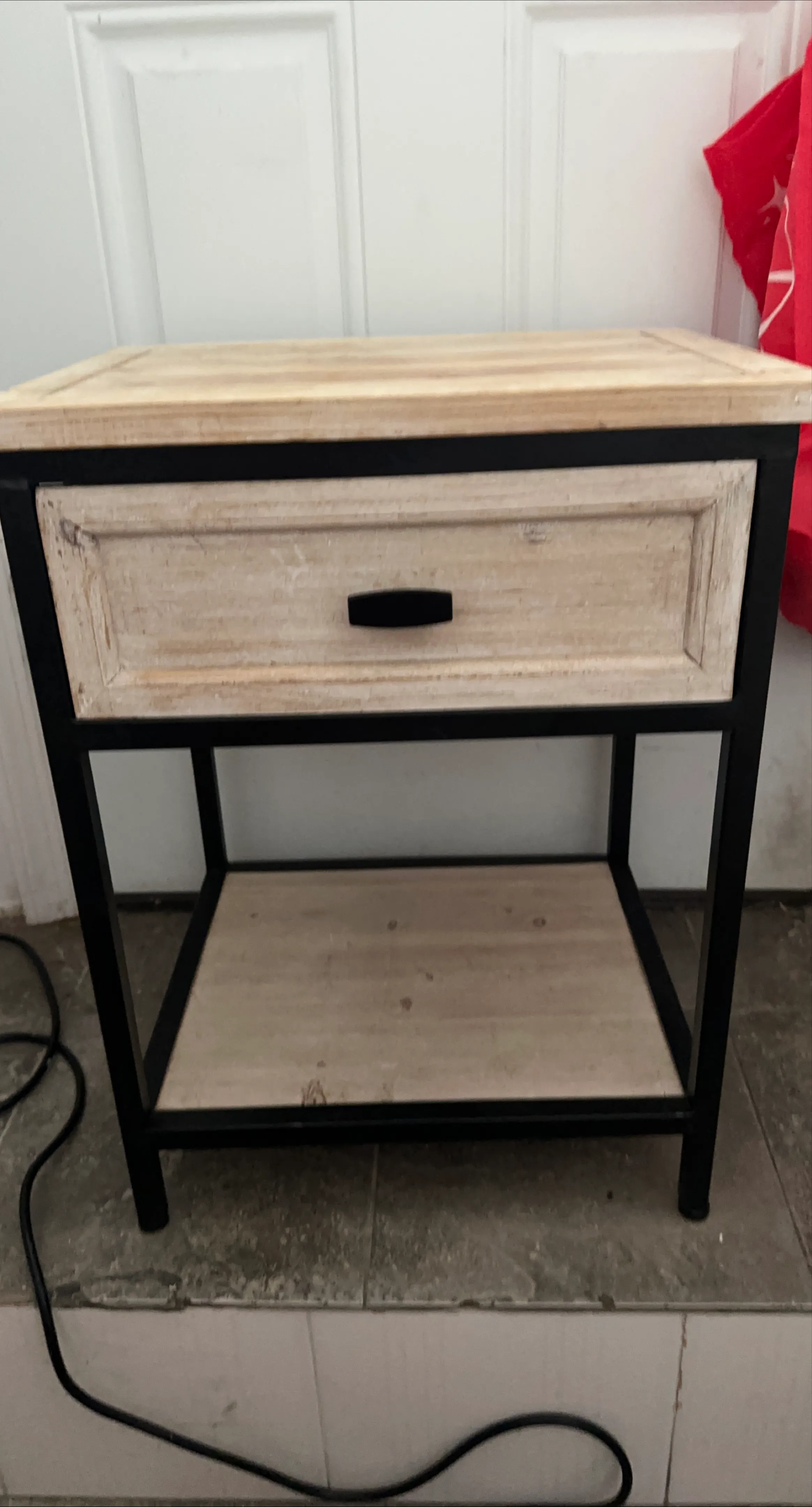 Giving away this accent table with a drawer! It features a light wood top and drawer front with a black metal frame. Perfect for a bedside table or living room accent piece. It got a bit wet by the rain, but still looking good.