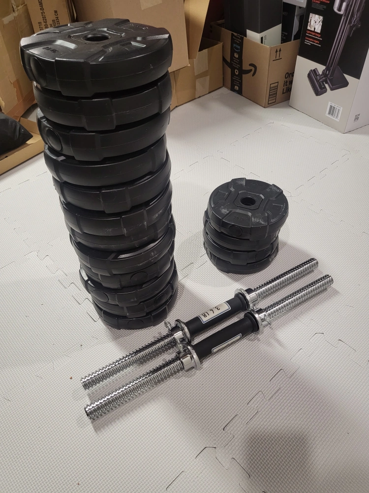 Selling a set of weight plates and dumbbell bars. The weights are in good condition and ready for your home gym.