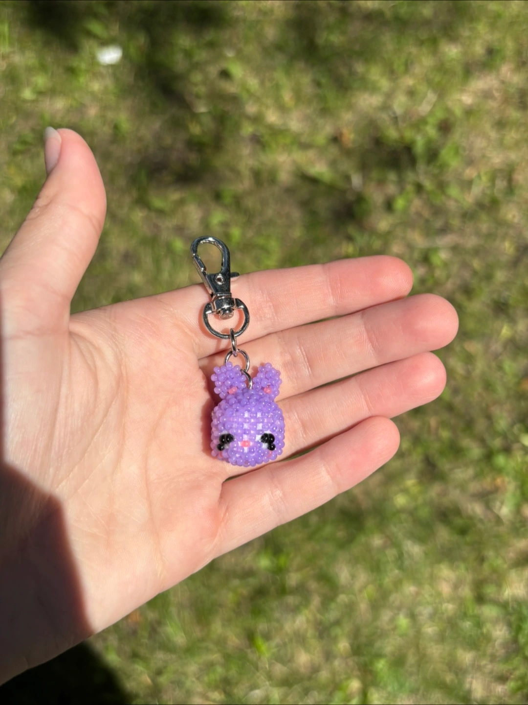Here's a cute little purple bunny keychain! It's made of tiny beads and has a silver-tone clip to attach to your keys or bag. It's in great condition and ready for a new home