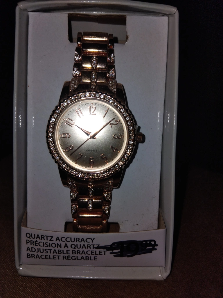 Selling a rose gold-tone watch with quartz accuracy. It features an adjustable bracelet and comes in its original box. It's a lovely piece for adding a touch of elegance to any outfit