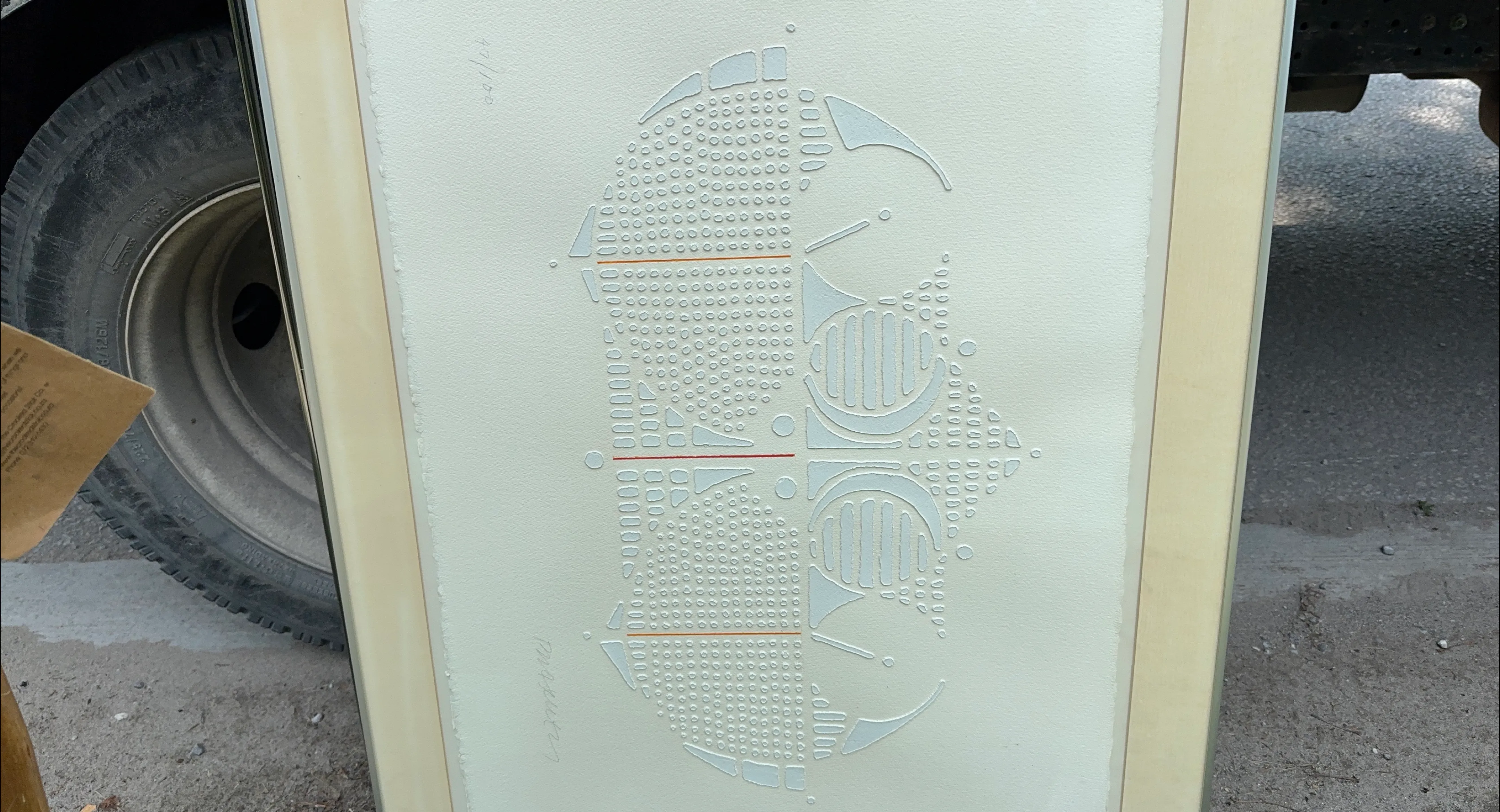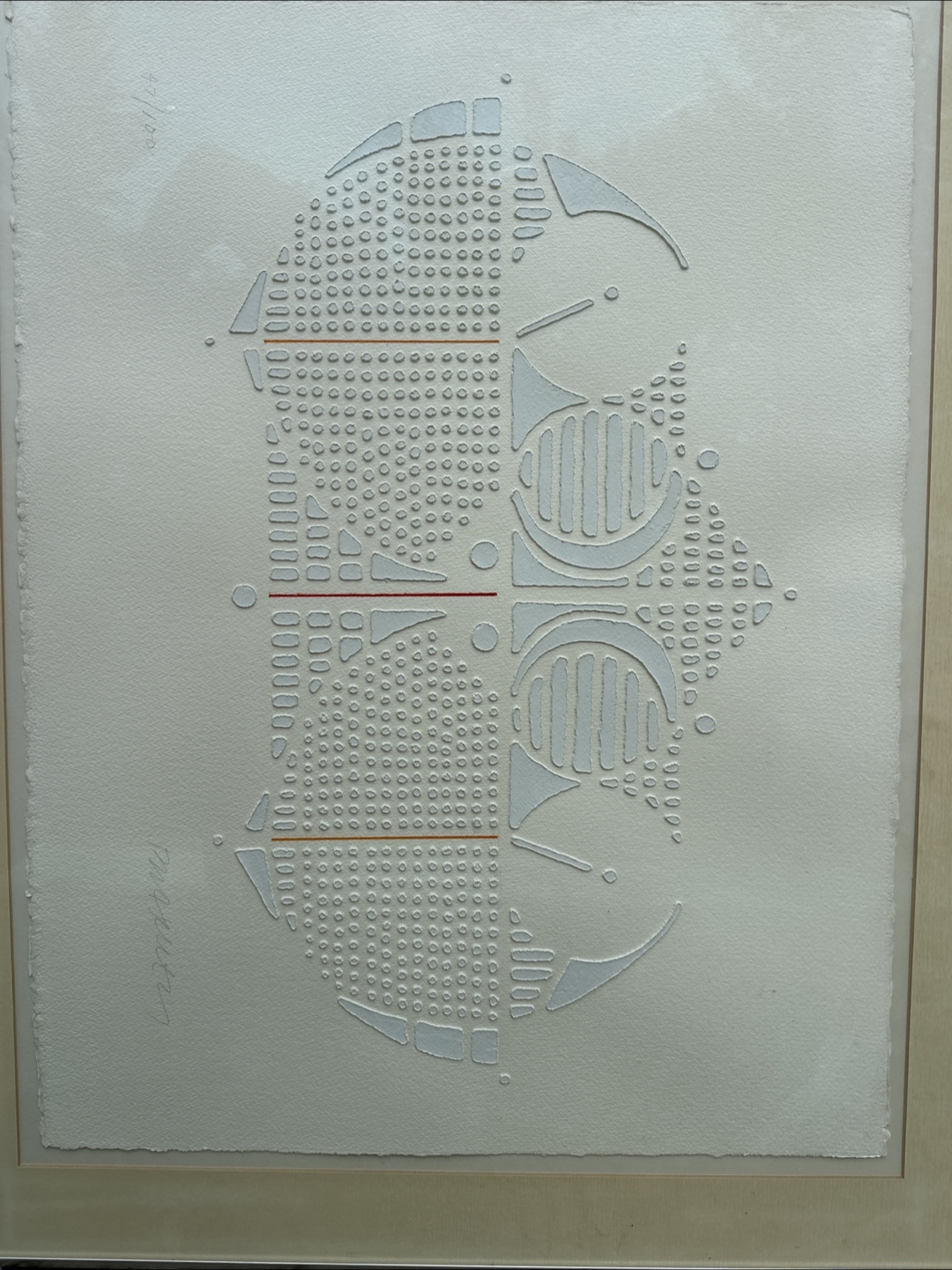 Unique embossed art print in a frame! The design features a geometric pattern with raised dots and lines, creating a textured effect. It's a cool piece to add some visual interest to your space