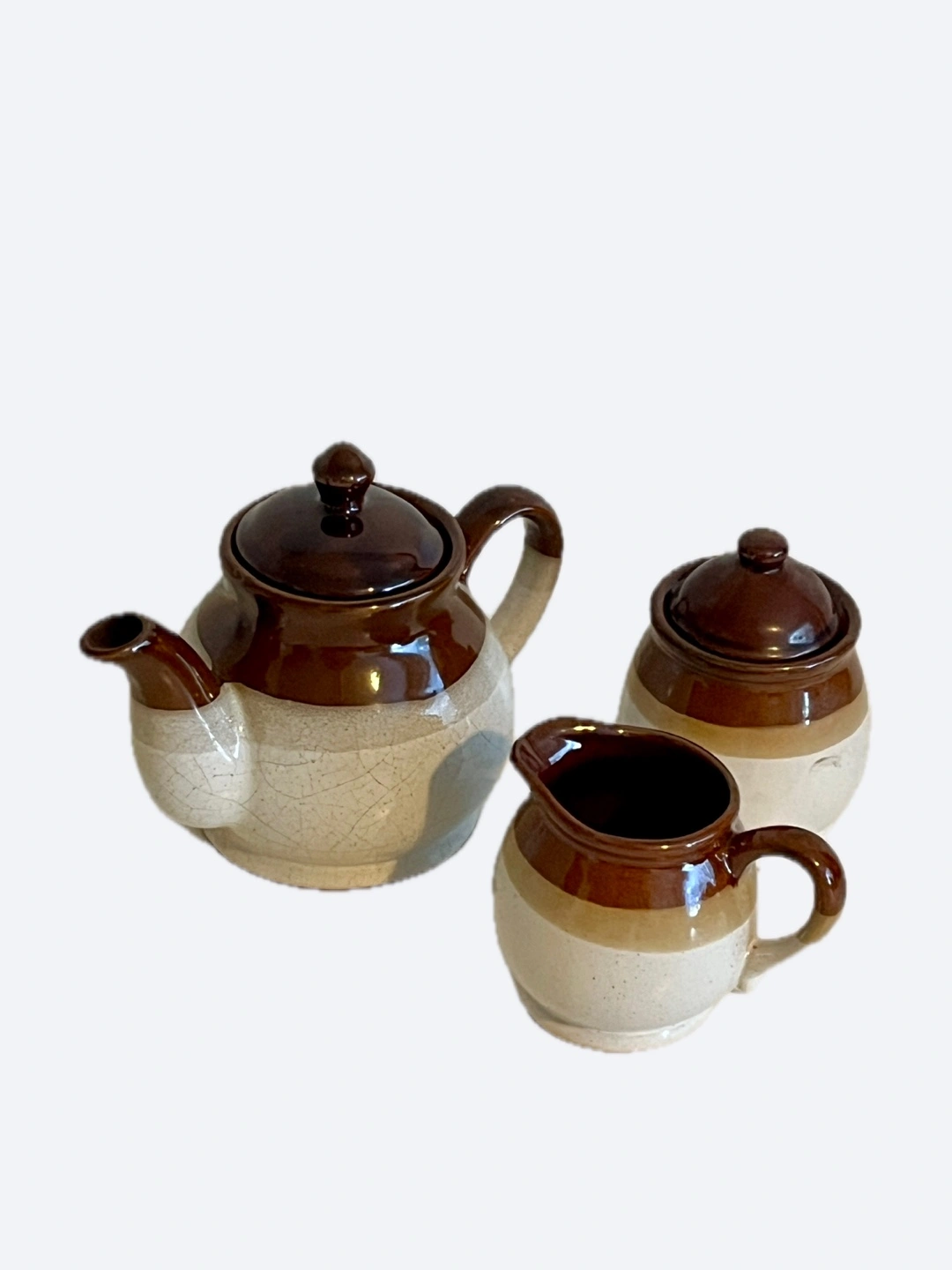 Selling a charming vintage teapot set with a lovely brown drip glaze design! Includes a teapot, creamer, and sugar bowl. Perfect for adding a touch of retro style to your kitchen or tea party.