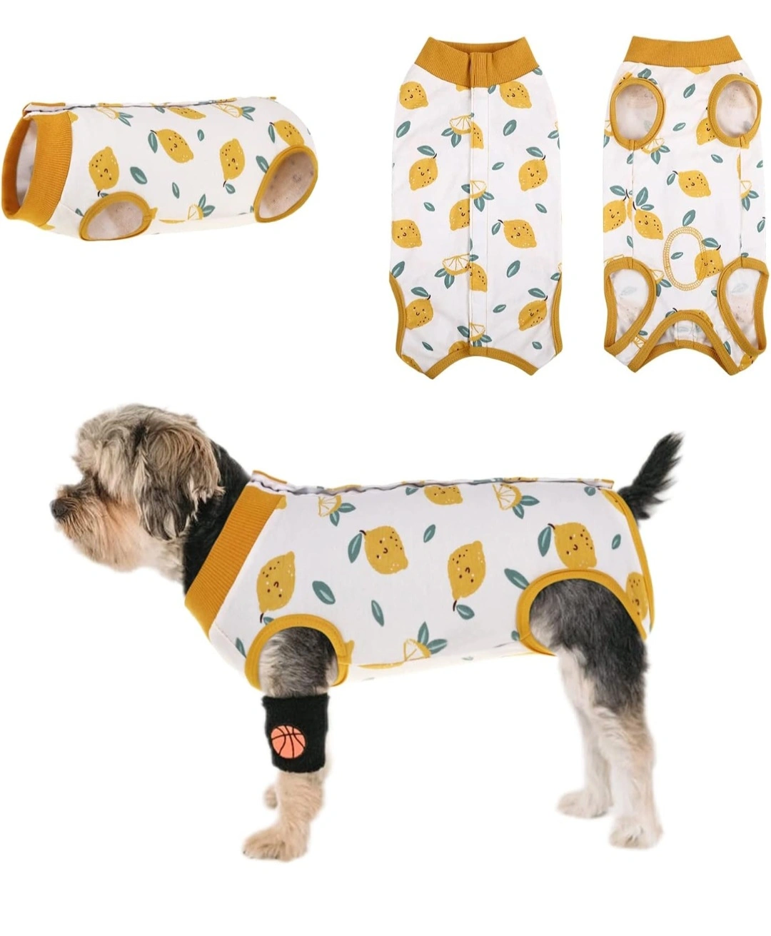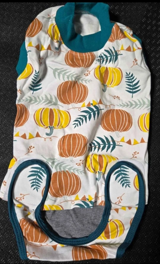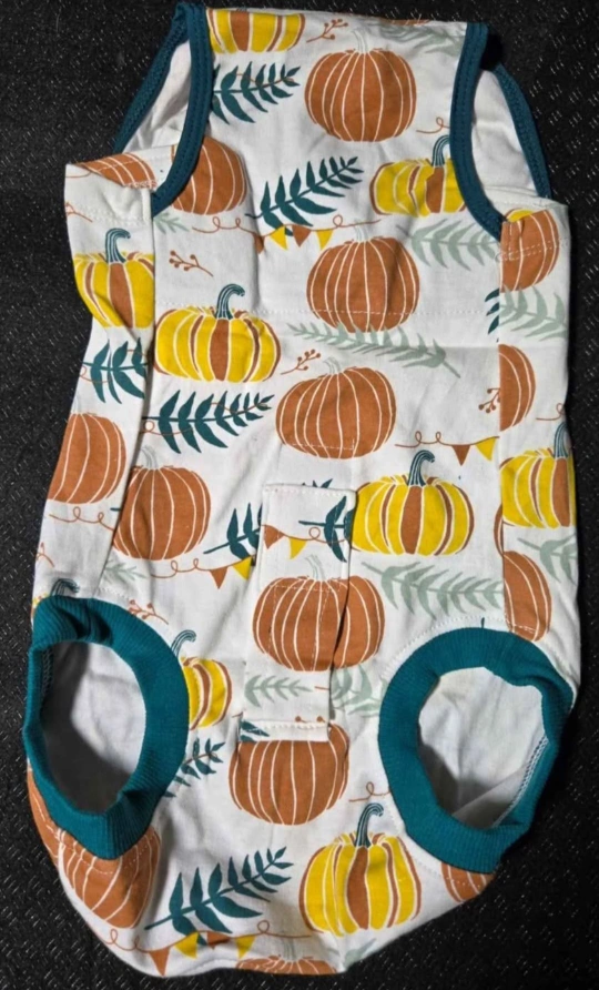 It features a cute pumpkin print design. Perfect for preventing pets from licking wounds and keeping them cozy.