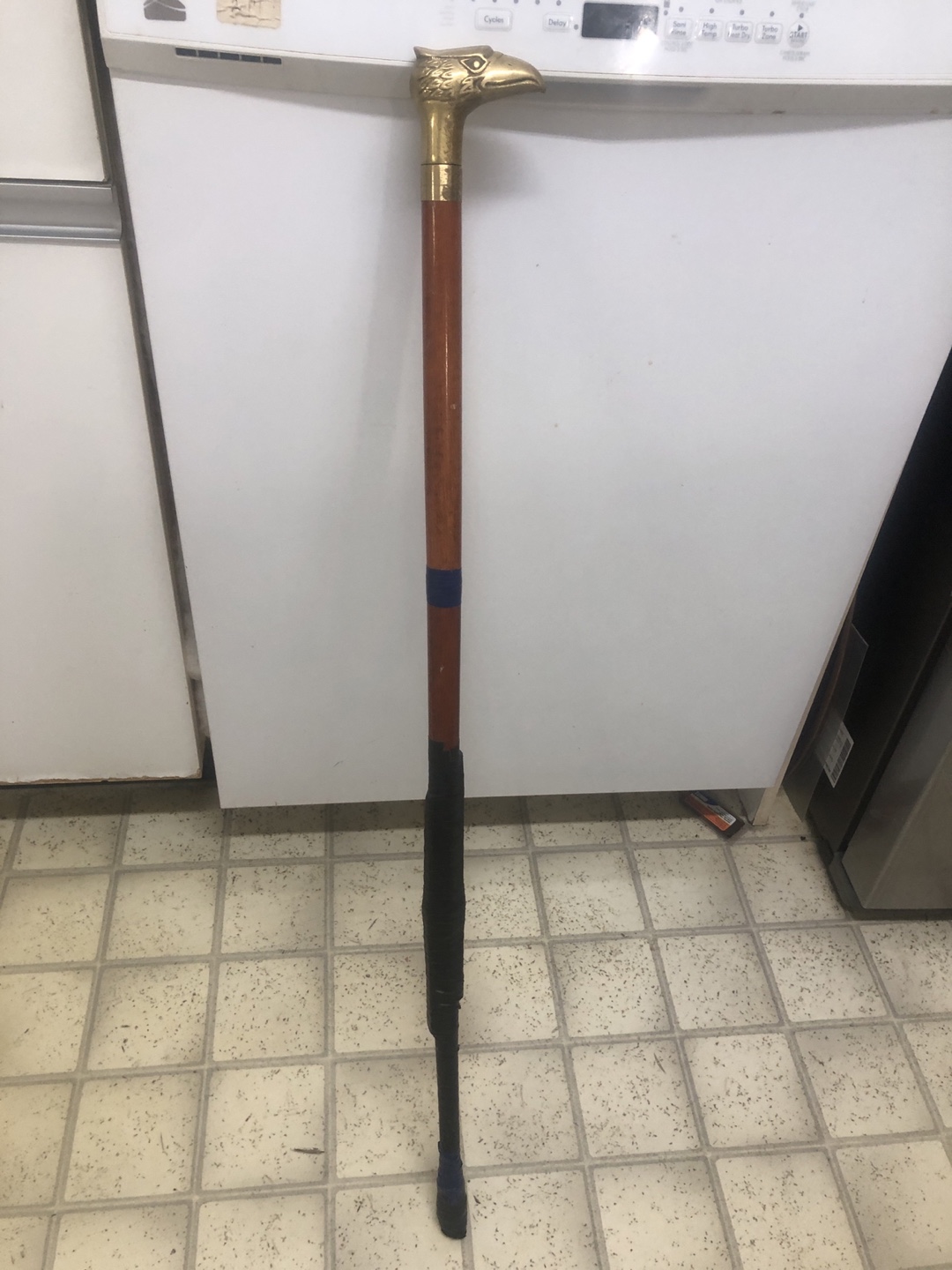 Selling a walking stick with an eagle head handle. It's made of wood and has a brass eagle head. There is some black tape wrapped around the bottom portion of the stick.