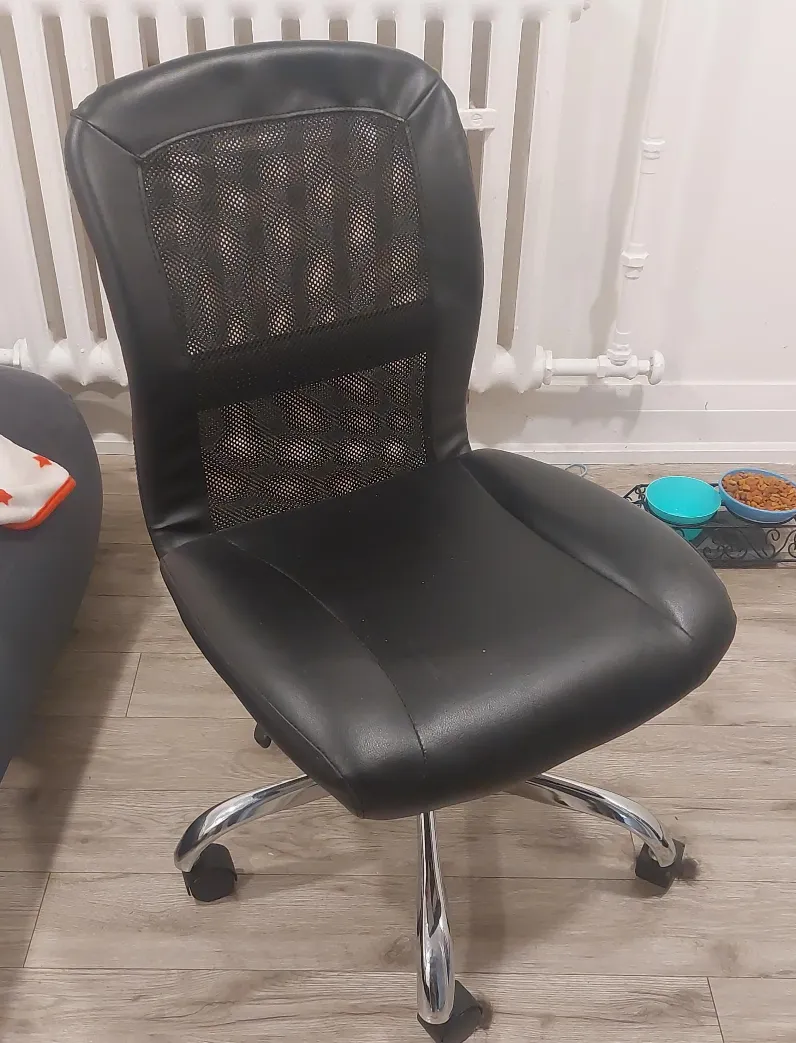Selling a black office chair in good condition. It features a mesh back for breathability and a comfortable seat. The chair has a chrome base with wheels for easy movement. Perfect for your home office setup!