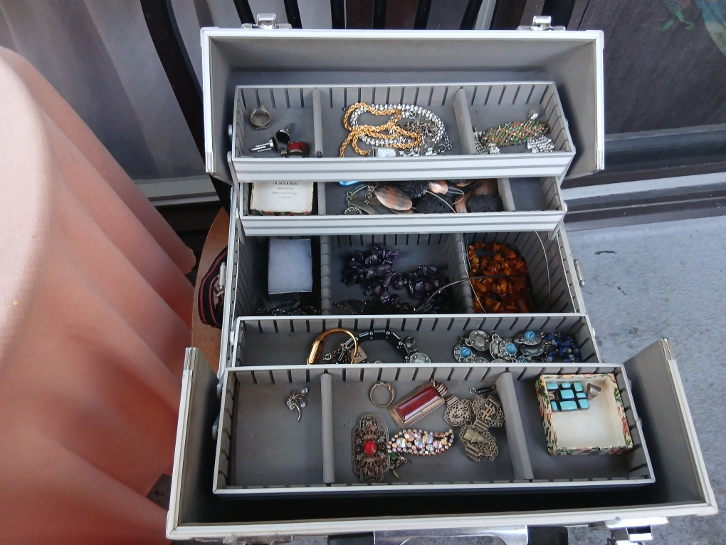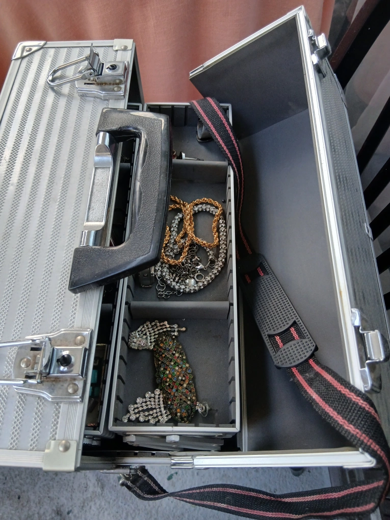 Selling a silver aluminum make up case by MAC that can be used as a jewelry organizer box. It has multiple drawers for organizing your jewelry and accessories. The box a strap, a handle and latches for secure closure, making it easy to carry around. Was 120.