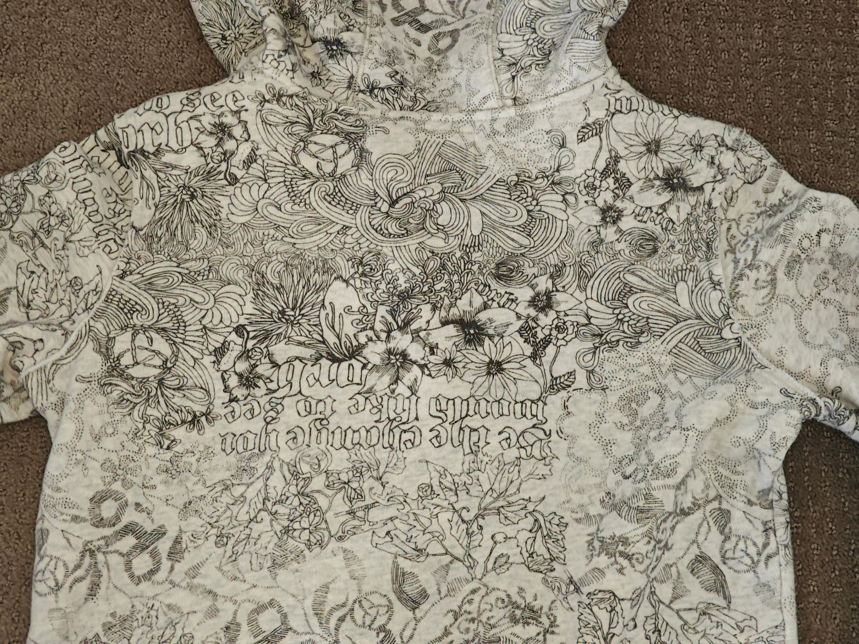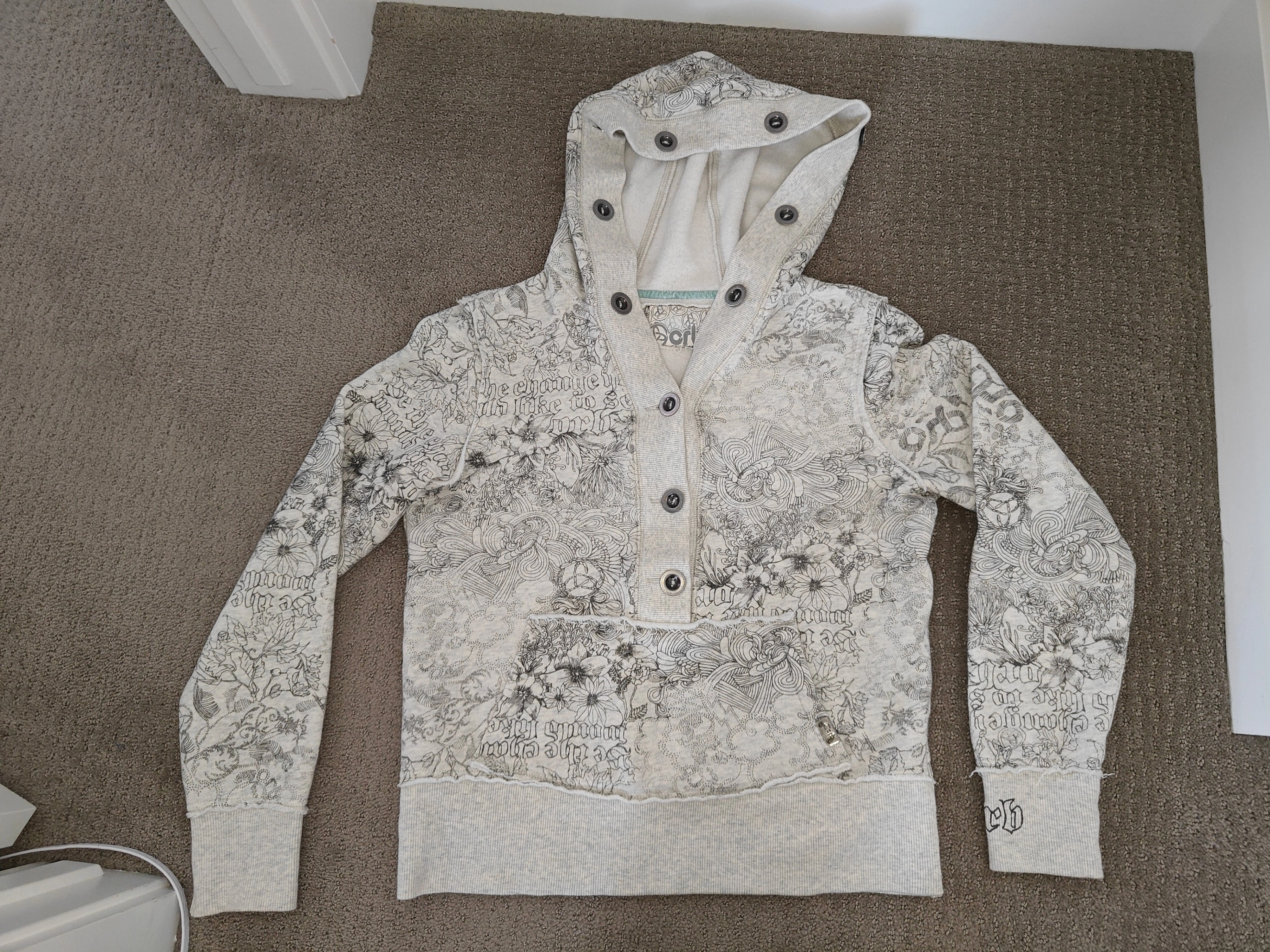 I am selling a Woman Orb Brand Sweater Hoodie - Unique All-Over Print in used, excellent condition. No rips, holes, or tears. Elevate your casual style with this distinctive hoodie from the Orb brand. This unique piece features an eye-catching all-over dark grey and white print, giving it an effortlessly cool and artistic vibe. This isn't your average hoodie, it's perfect for adding a statement to your everyday wardrobe, whether you're heading out or staying in.