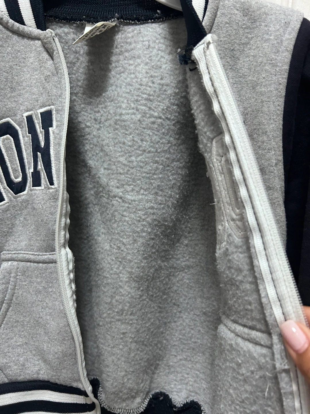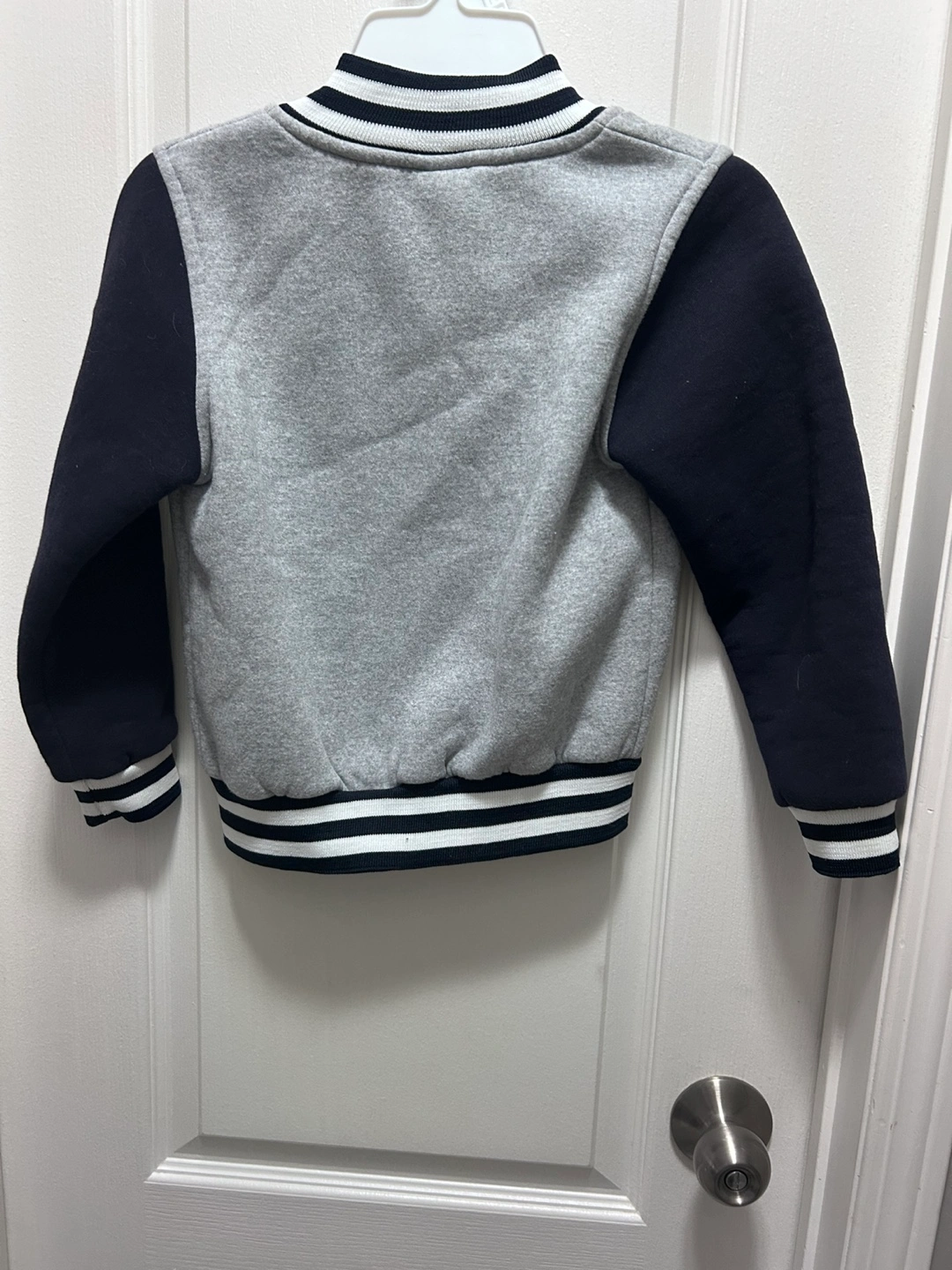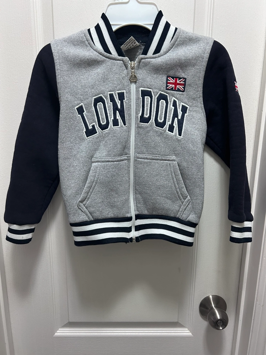 Cozy McAlly London jacket in size 5/6! It's a grey and navy blue colour with the Union Jack flag on the sleeve. Perfect for keeping your little one warm and stylish.