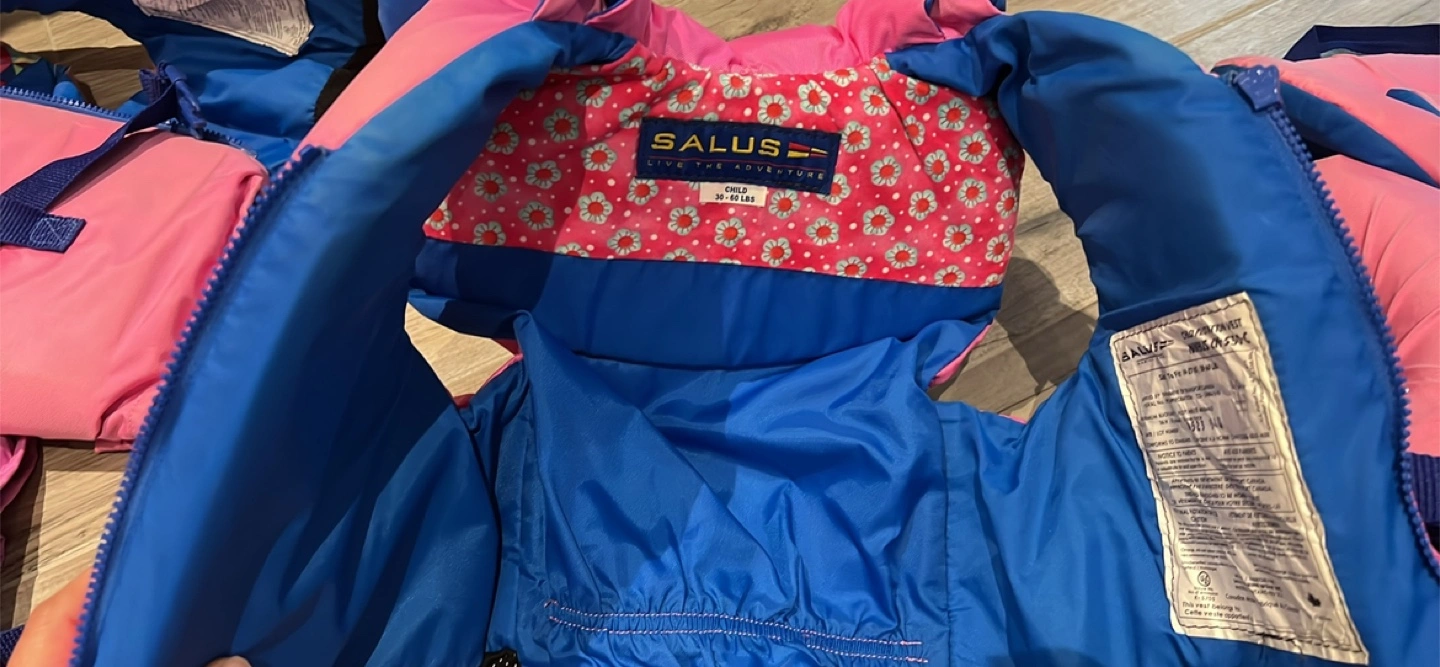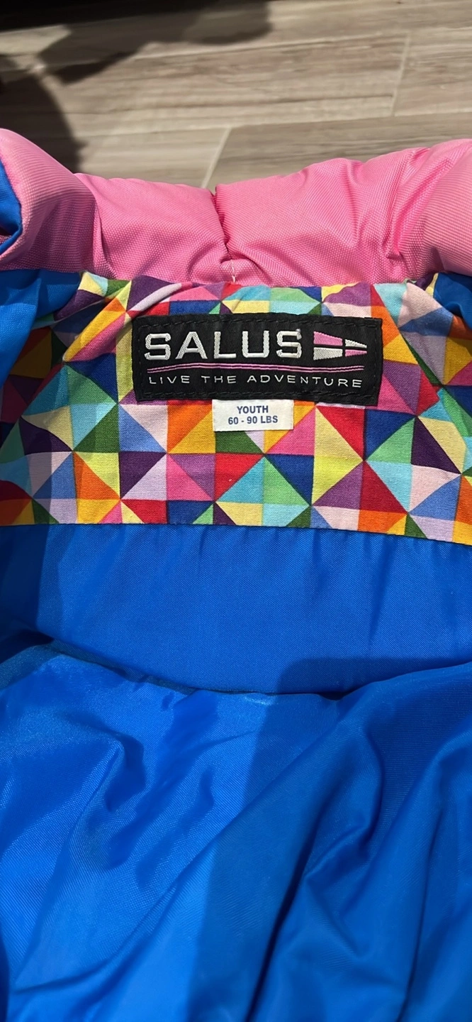 Selling a Salus life jacket, perfect for keeping your little one safe on the water! It features a pink and blue design. There are different kind of sizes