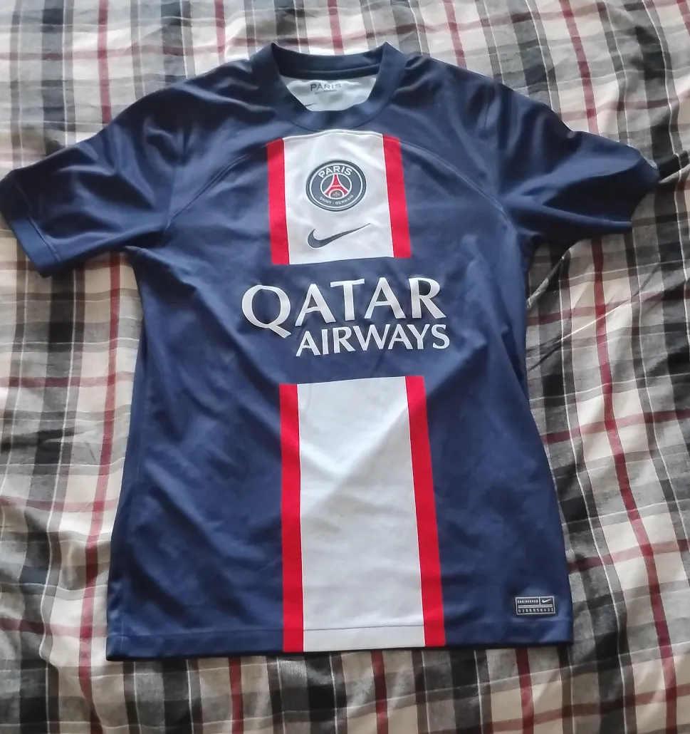 Selling a Nike Paris Saint-Germain jersey in size small! It's a stylish blue colour with the Qatar Airways logo. The jersey also features Nike's Dri-FIT technology, perfect for staying comfortable.