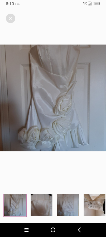 This is a cute white party dress with a floral design at the bottom. It is stretchy and shiny. It's like a wearable bouquet, perfect for twirling the night away! This dress was worn once and needs to be washed.