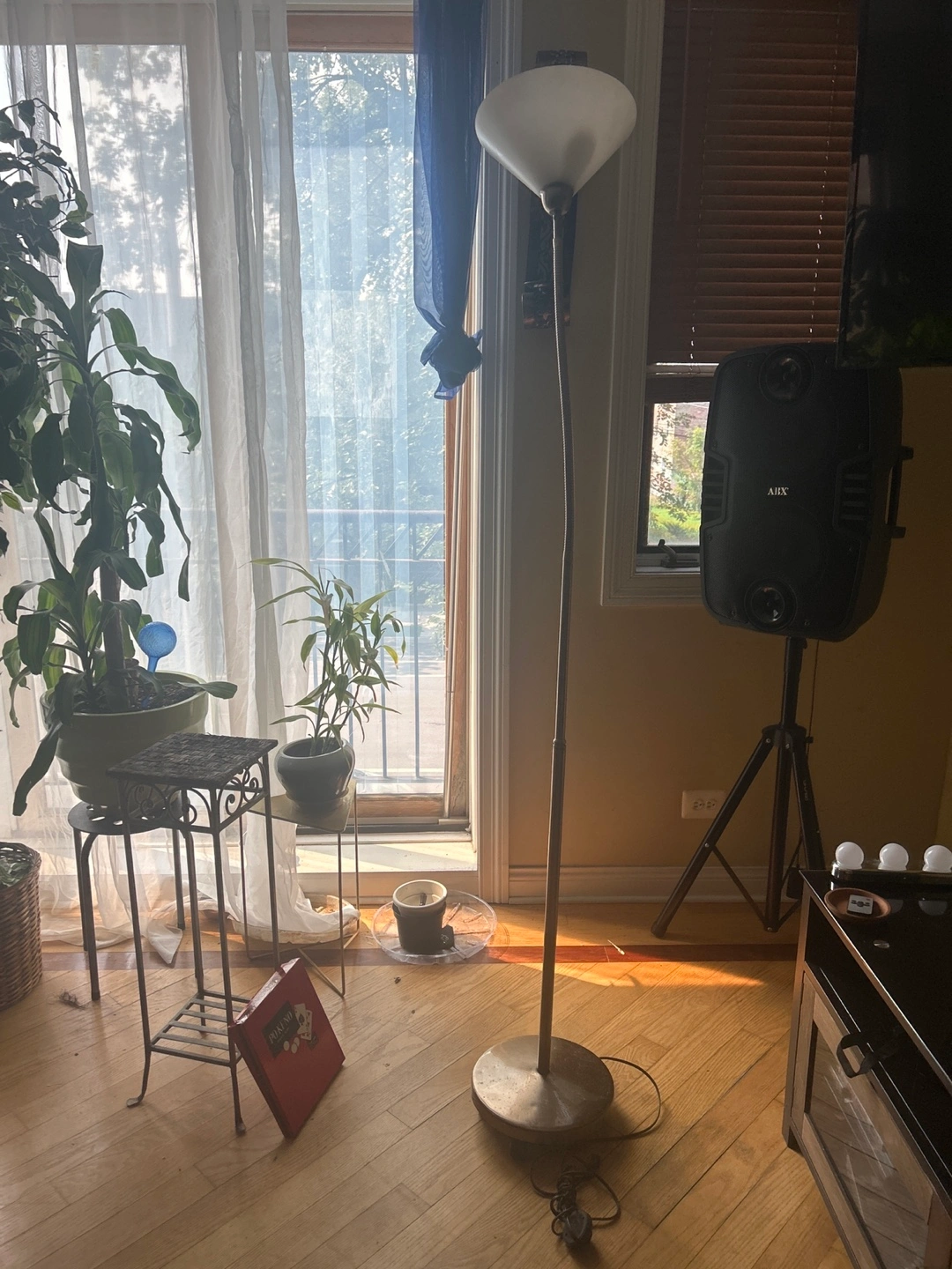 Selling a floor lamp on wheels with adjustable leverage. It's in good condition and ready to brighten up your space! It features a sleek design that complements any room decor
