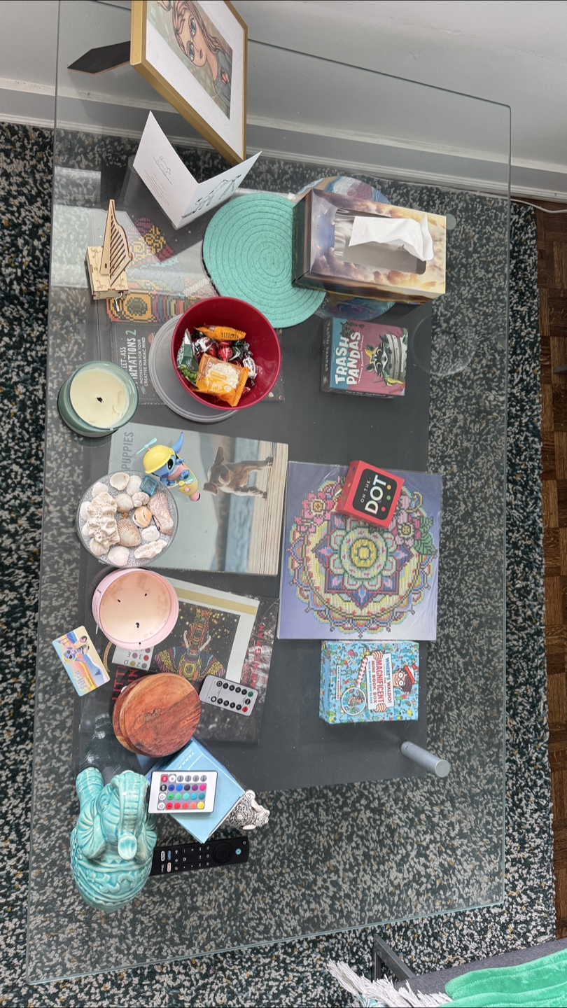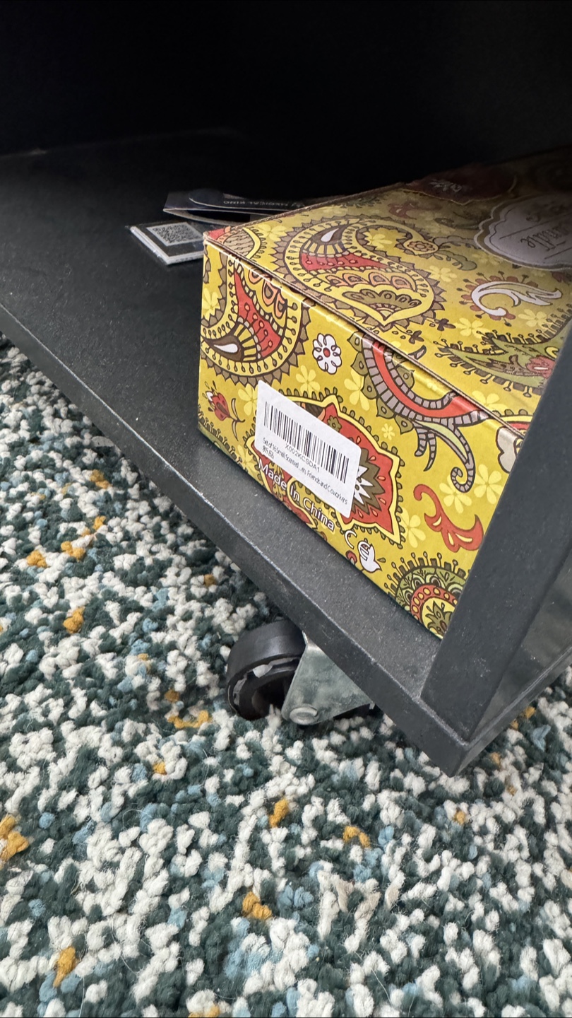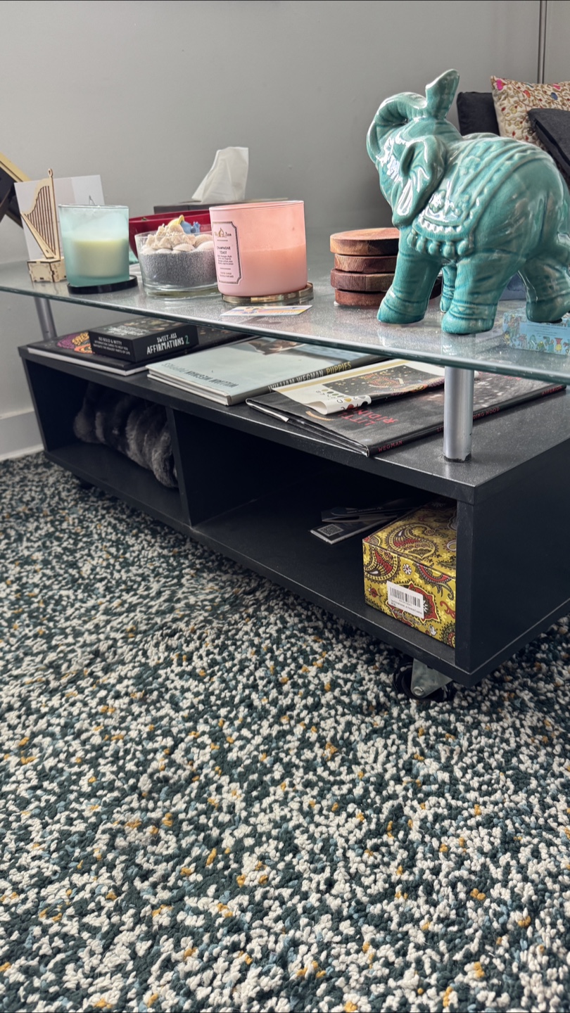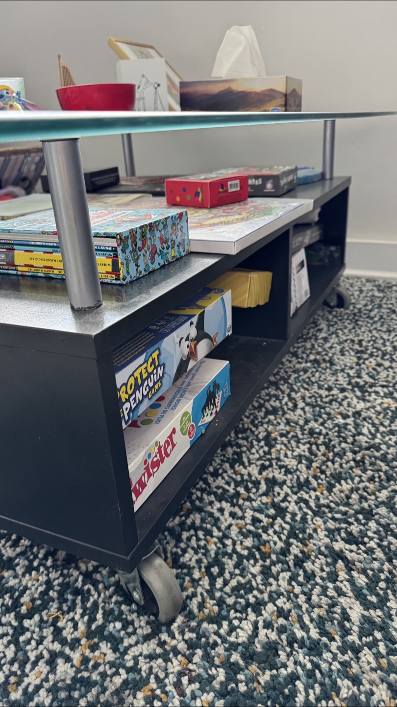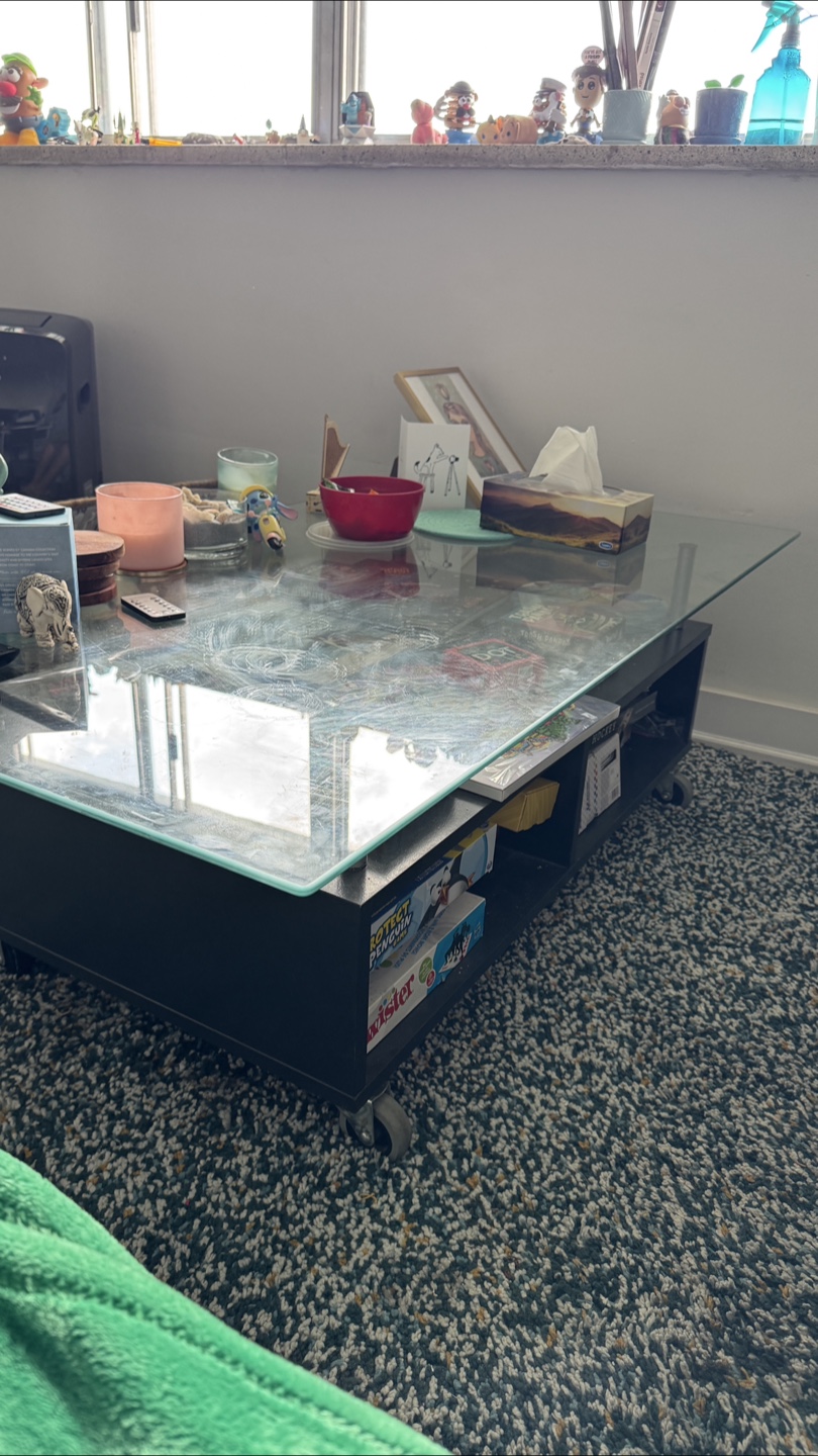 Selling a coffee table with a glass top and a black base. It has a shelf underneath for storage and is on wheels for easy moving (2 of the plastic wheels have cracked but still metal part rolls over rug - see last picture).