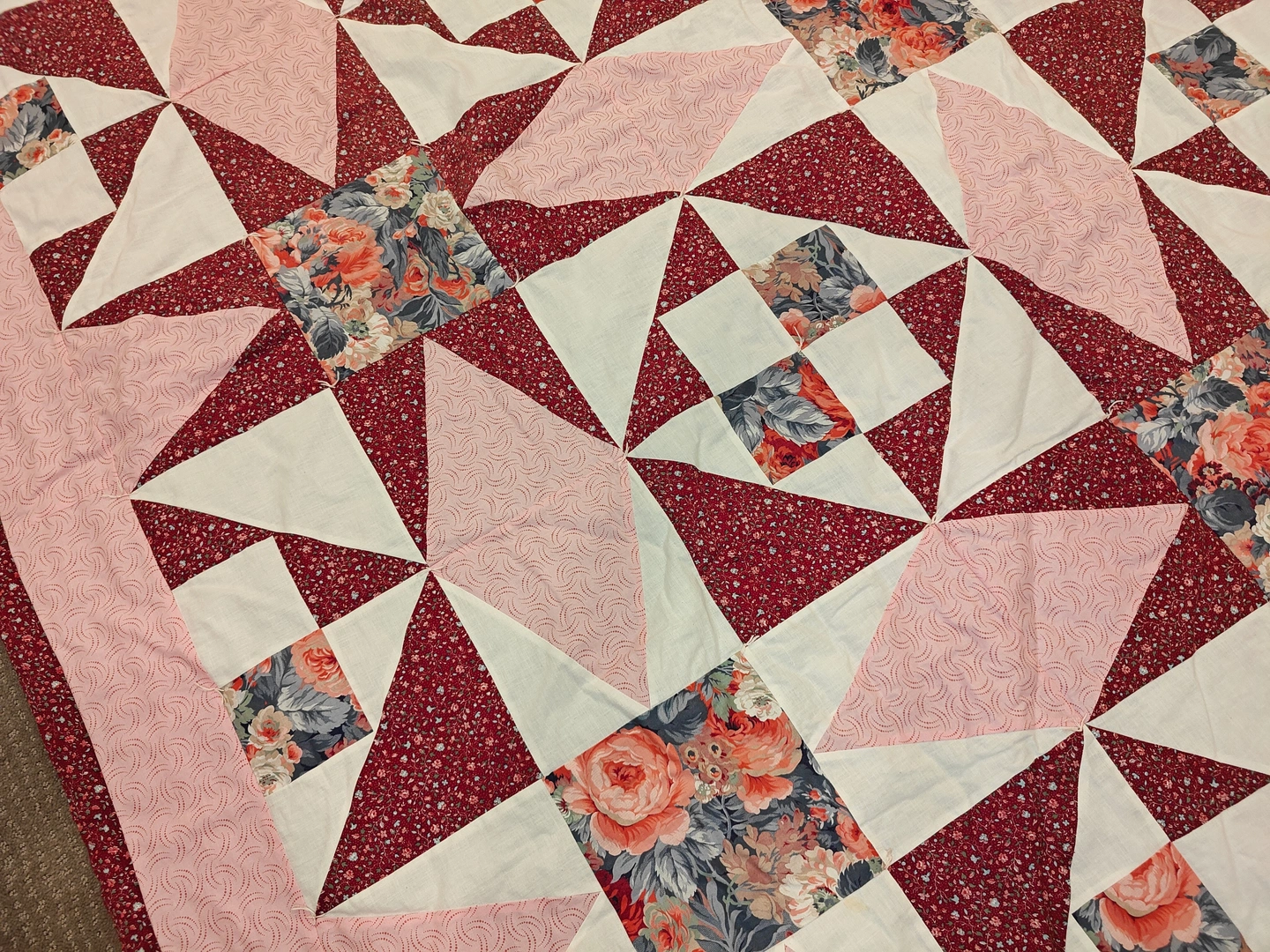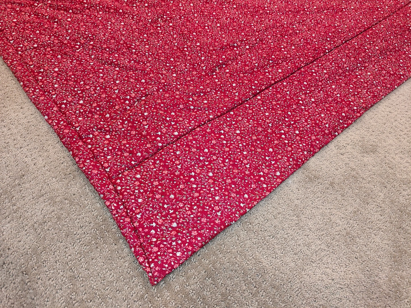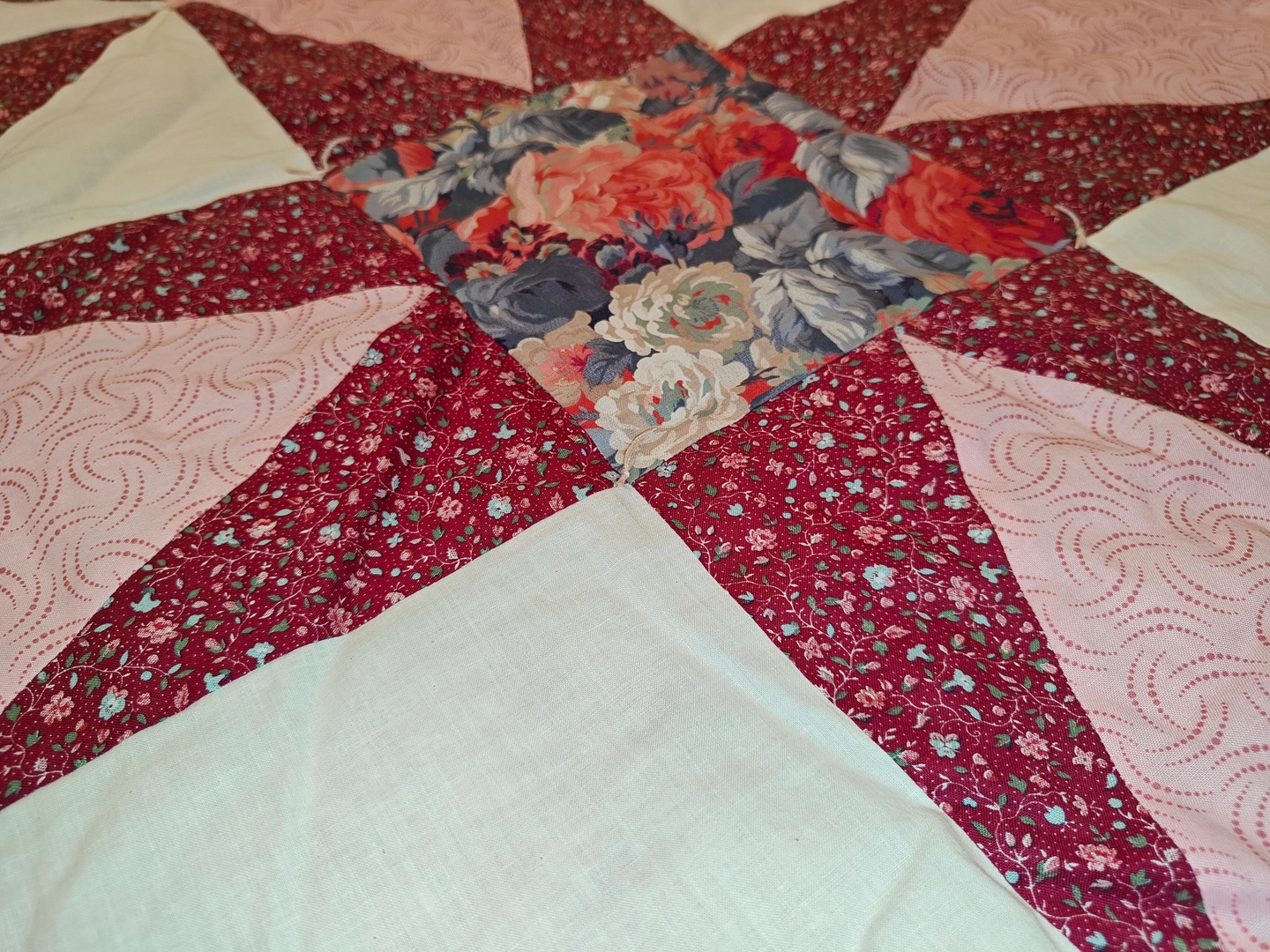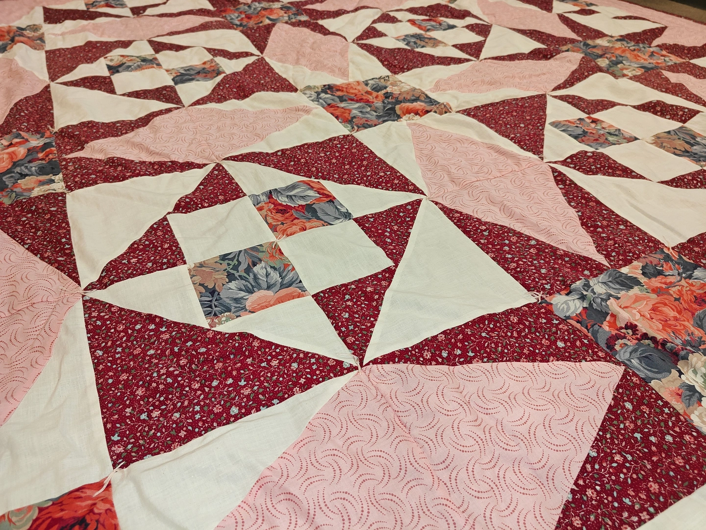This unique piece features a vibrant design of red, pink, and floral patterns. The low-loft batting makes this quilt lightweight and thin, perfect for a decorative accent on your bed or for comfortable use during the warmer summer months. It has been used only on a spare bed and is in excellent condition with no issues to note. Don't miss the opportunity to own this special, handmade item.