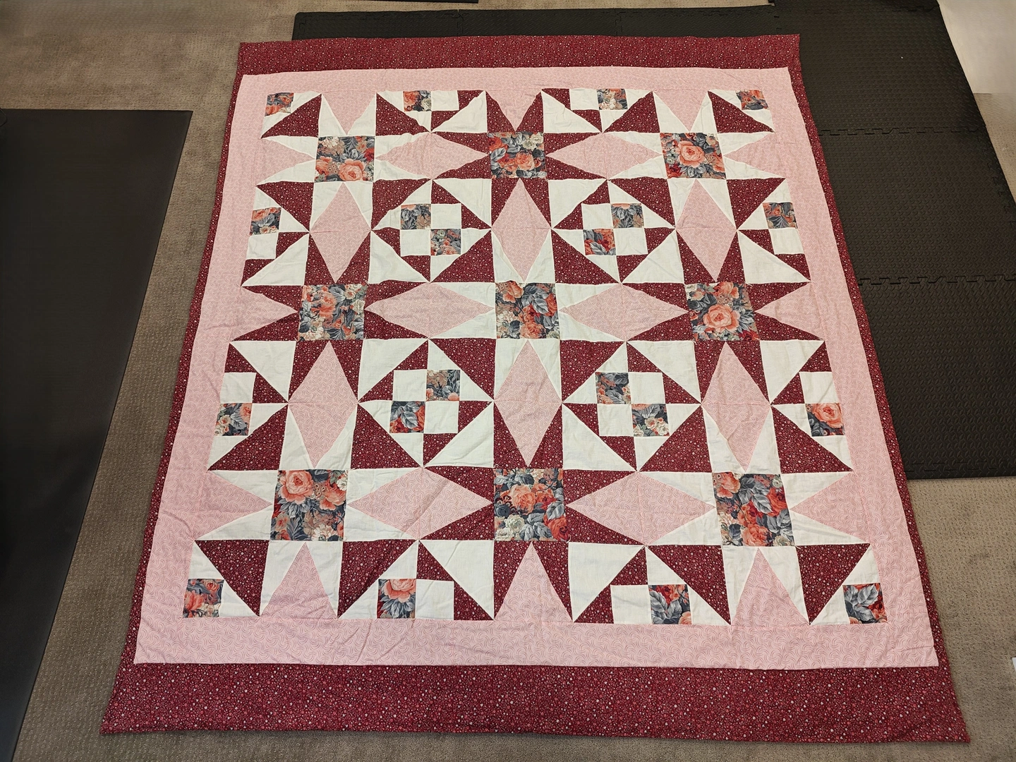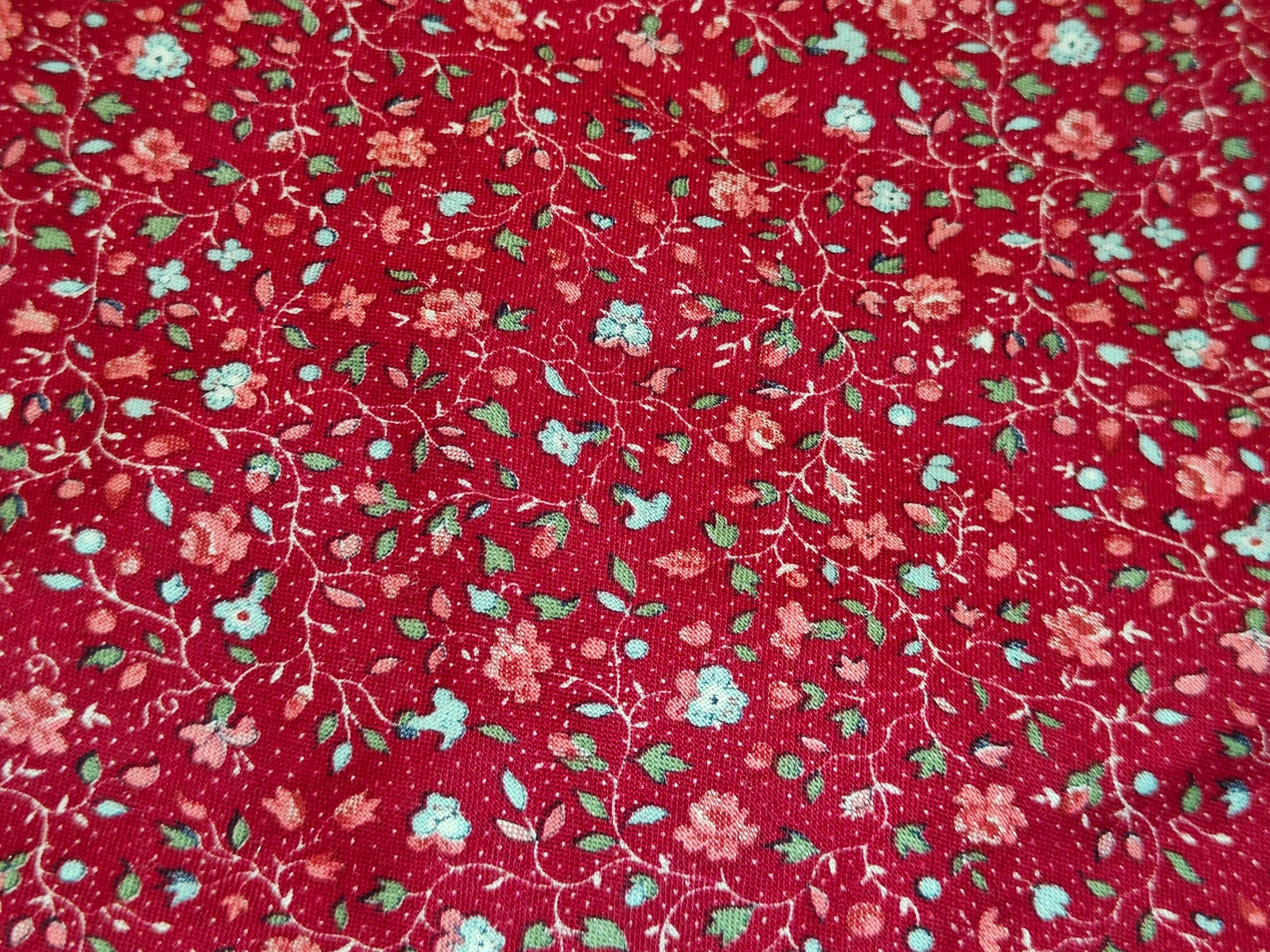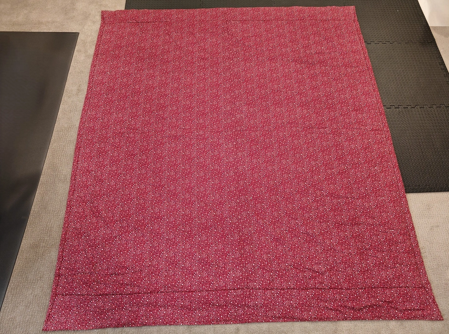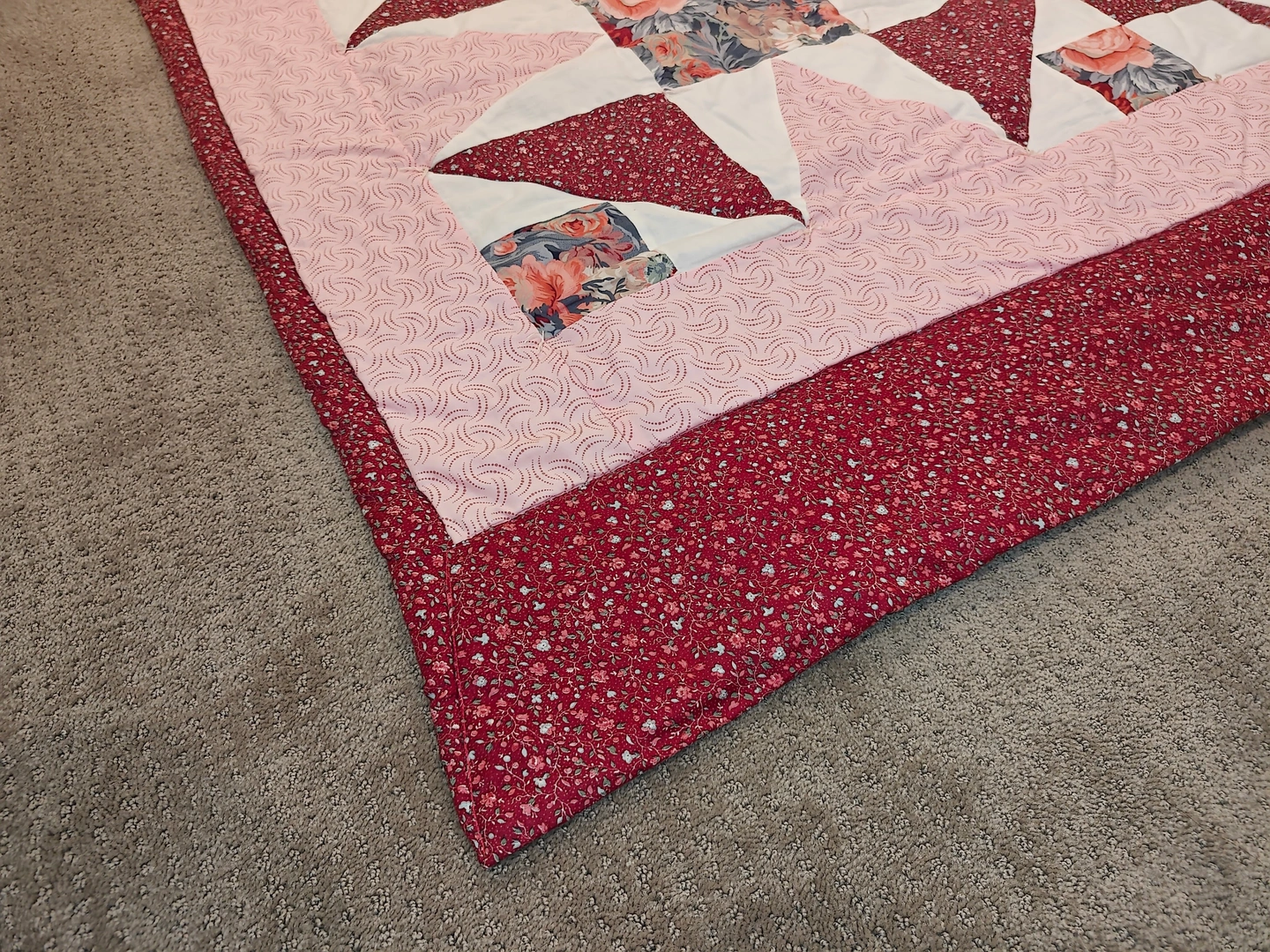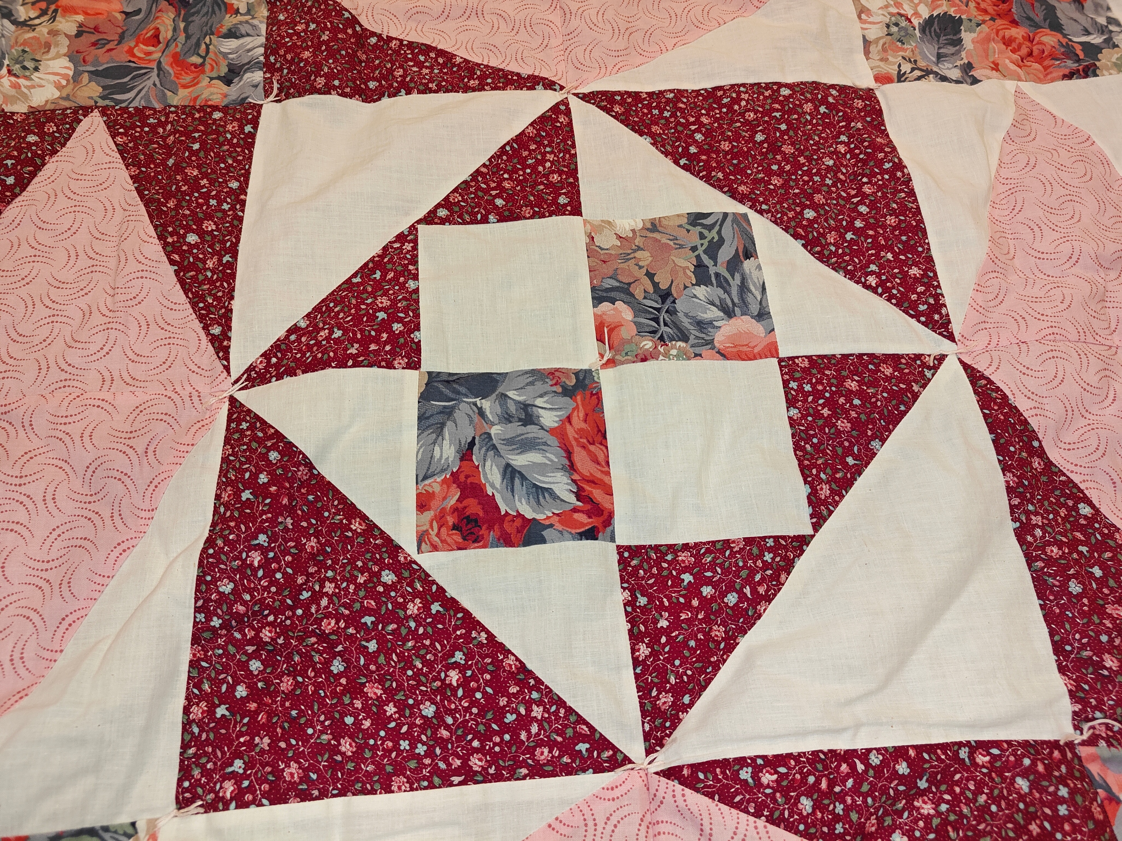 This unique piece features a vibrant design of red, pink, and floral patterns. The low-loft batting makes this quilt lightweight and thin, perfect for a decorative accent on your bed or for comfortable use during the warmer summer months. It has been used only on a spare bed and is in excellent condition with no issues to note. Don't miss the opportunity to own this special, handmade item.