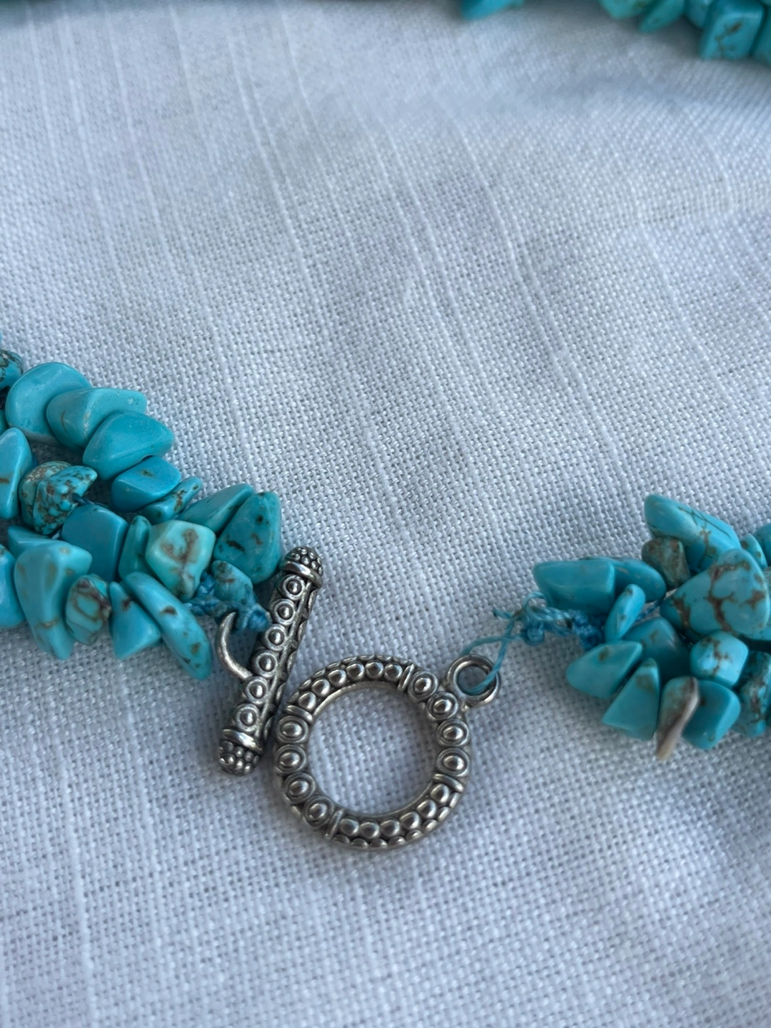 Here's a lovely turquoise necklace and earring set! The necklace is a multi-strand piece, and the earrings complement it nicely. Perfect for adding a pop of colour to any outfit