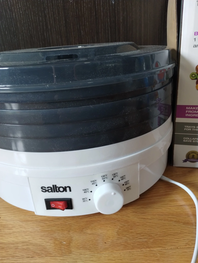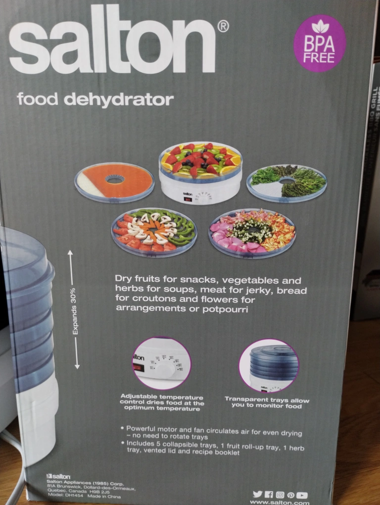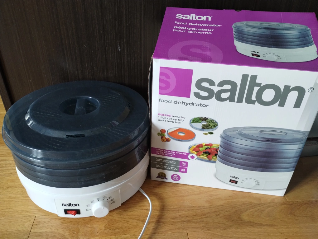 Selling a Salton food dehydrator. It comes with the original box and includes 5 collapsible trays, 1 fruit roll-up tray, and 1 herb tray. It also has a vented lid and recipe booklet. It's perfect for making healthy snacks from natural ingredients!