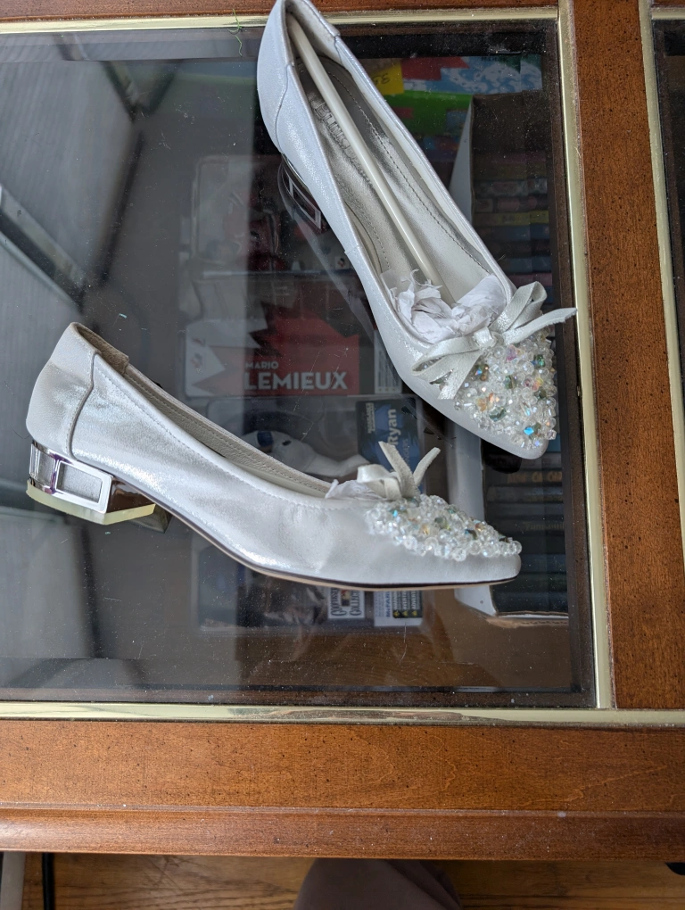 These silver heels are in great condition and would be perfect for a special occasion! They feature a cute bow and some lovely embellishments on the toe. The heel has a unique geometric design. They're sure to add a touch of elegance to any outfit!. worn once.