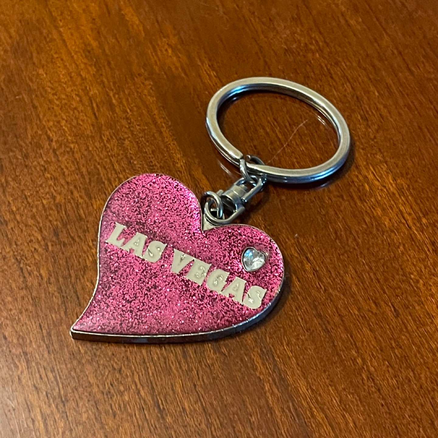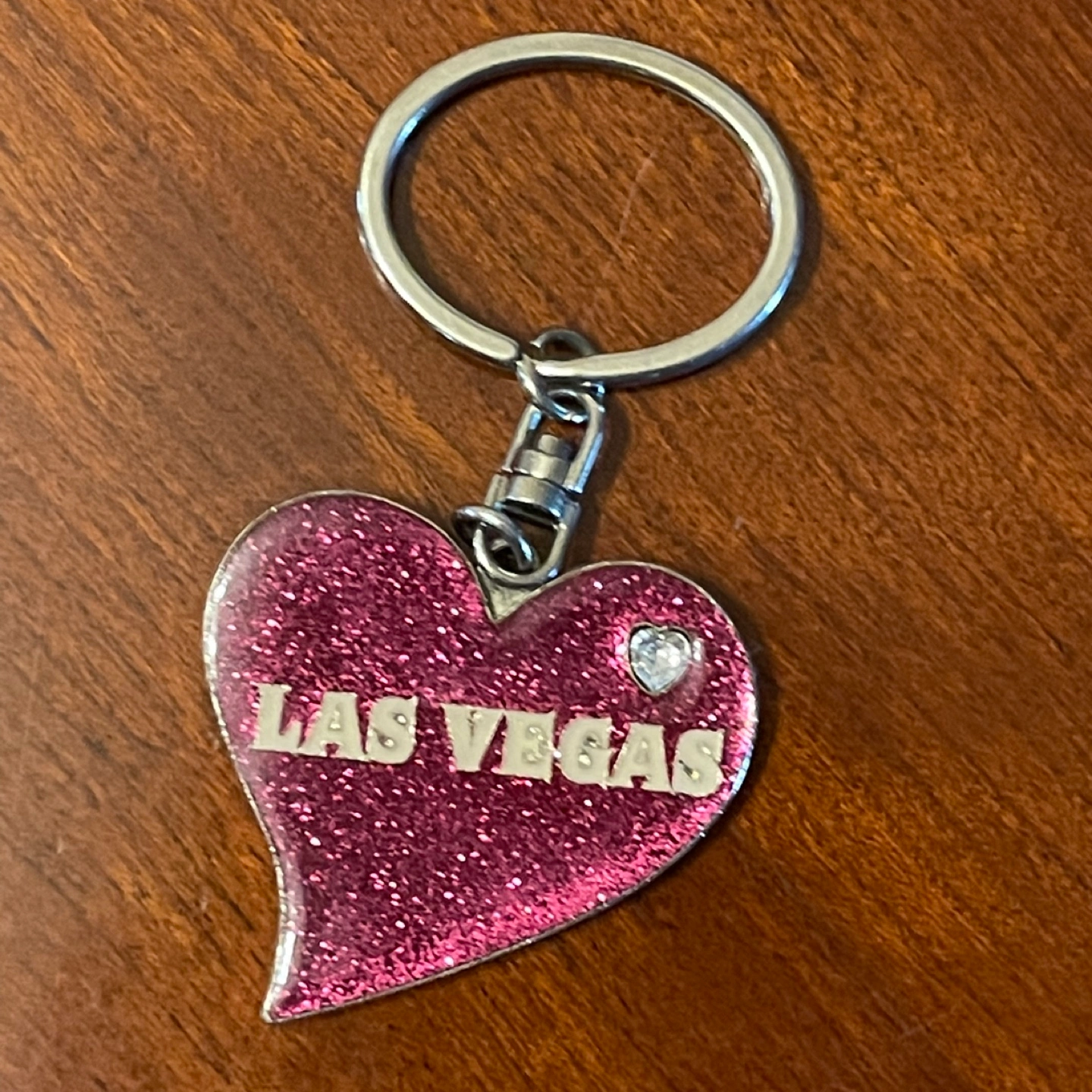 Cute Las Vegas heart-shaped keychain with pink glitter and a little rhinestone heart detail. Perfect for keys or a bag! Heavyweight and quality keychain