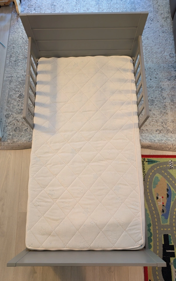 Grey Toddler Bed with thin mattress (crib size)