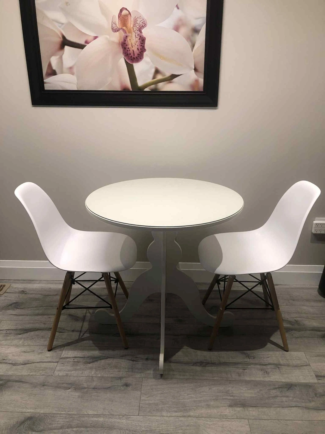 Selling a cute round dining table with two matching white chairs. Perfect for a small space or cozy breakfast nook. The chairs have wooden legs and a comfortable seat. The table is in good condition and ready for a new home!