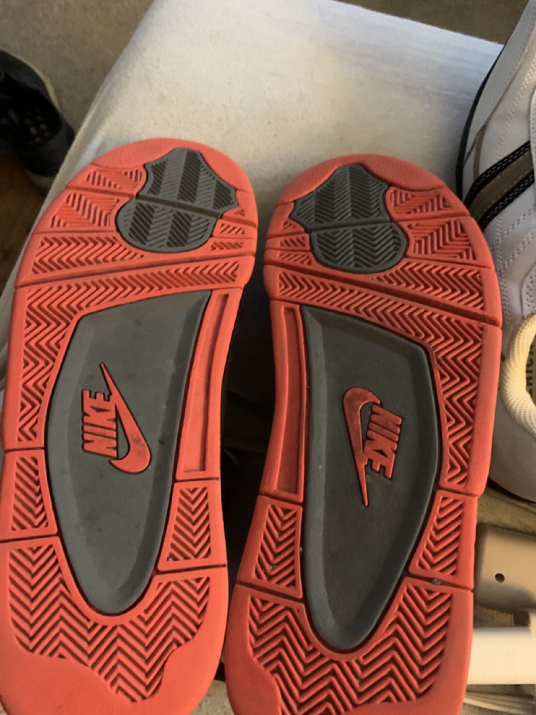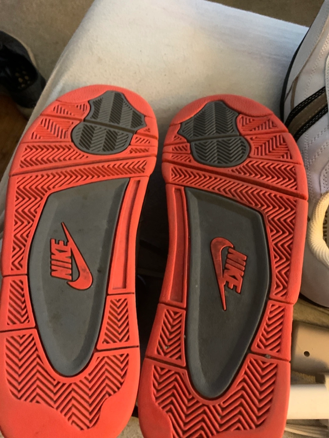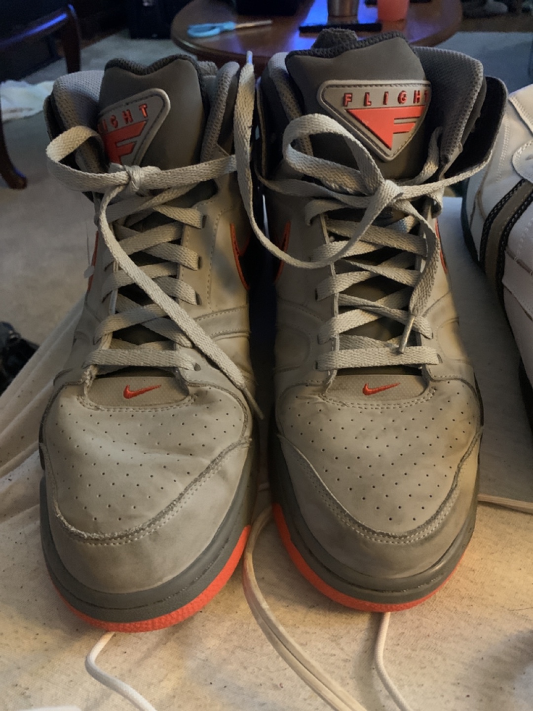 Selling a pair of Nike Flight high tops in grey and orange. They show some signs of wear, as you can see in the photos, but still have lots of life left in them! Great for basketball or just casual wear.