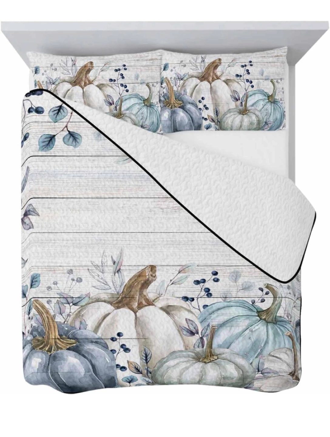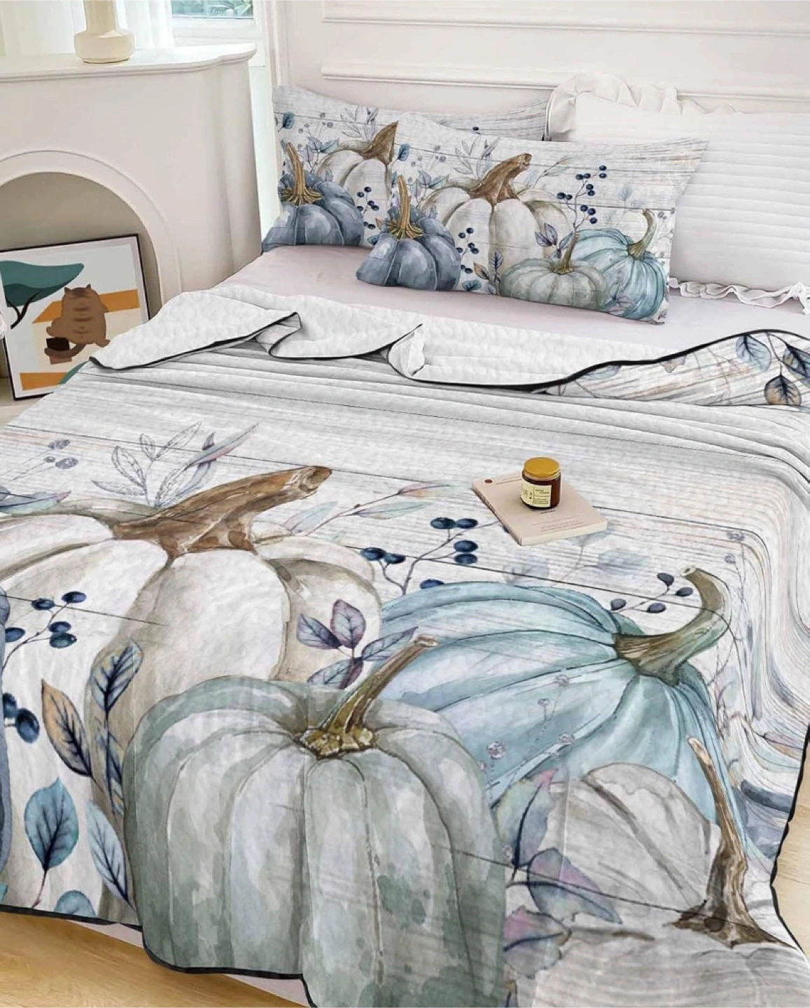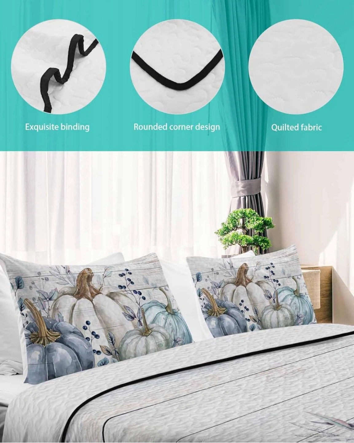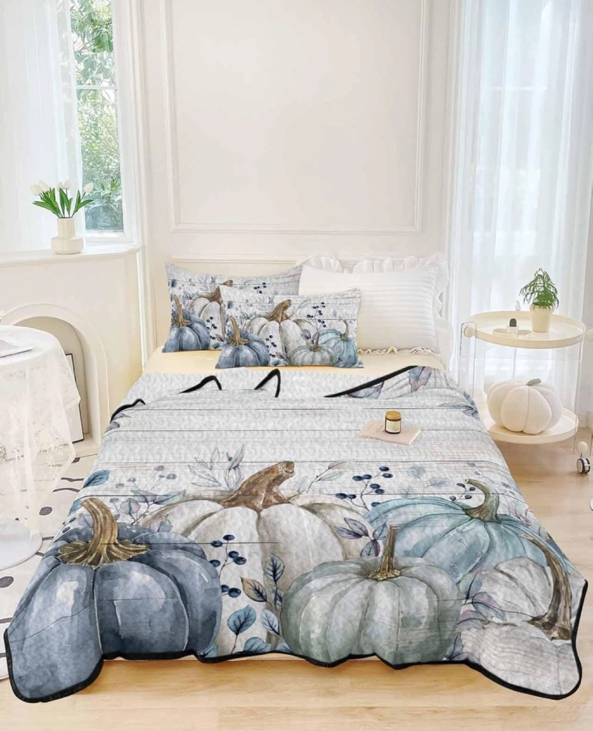 Add a touch of seasonal charm to your bedroom with this pumpkin print bedding set! The set includes pillowcases with an envelope closure and exquisite stitching. The quilt features rounded corner design and quilted fabric. Available in various sizes to fit your bed perfectly