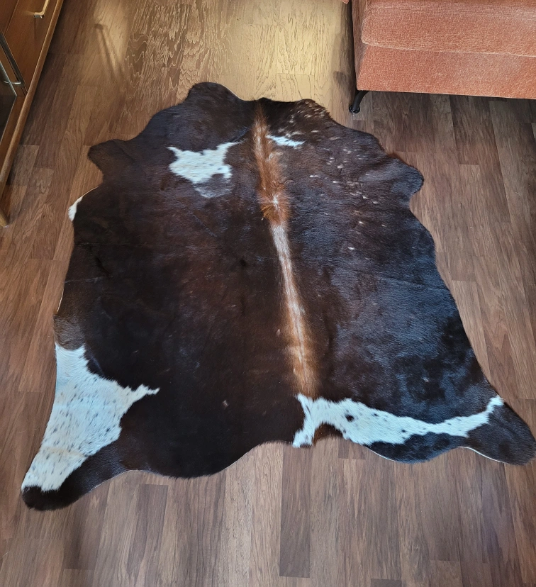 Selling a cowhide rug in brown and white. It's a unique piece that adds a touch of rustic charm to any room. The rug is in good condition and has a beautiful natural pattern. Perfect for adding some texture to your space!